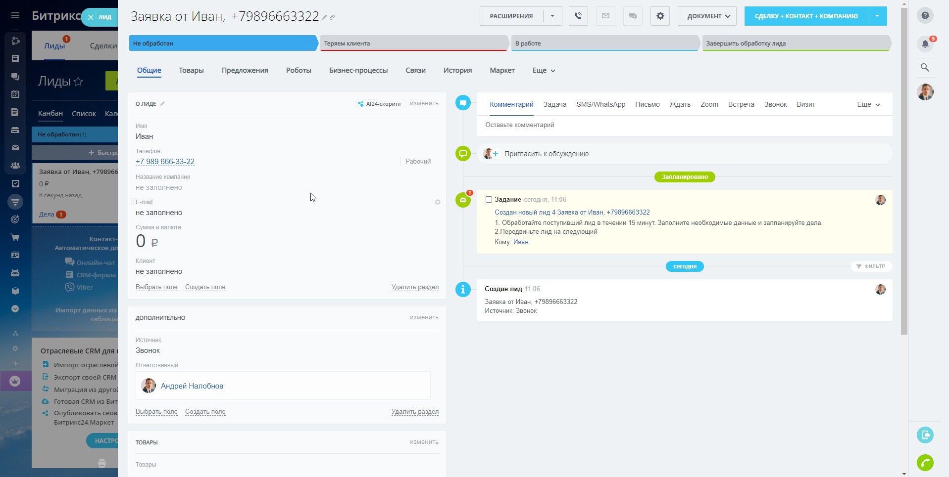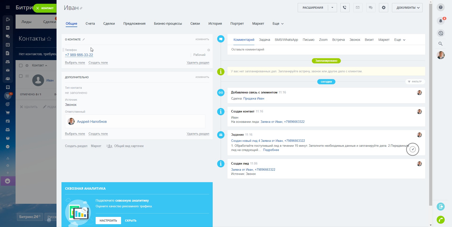 Также на этой стадии настроен туннель продаж, который создаст сделку в воронке "Сервисное обслуживание".