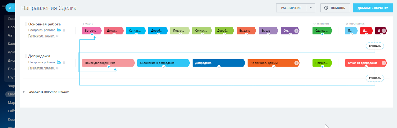 Если у вас тариф из архивной линейки - Старт+ и Задачи+ - вам будет доступна основная воронка - работа с лидами и сделками главного направления, настроенные карточки лида, контакта и сделки со всеми дополнительными полями. На тарифах CRM+, Команда и Компания добавляется направление Допродажа, заполнение обязательных полей от статусов/стадий и роботы с напоминаниями, контролем и расчетом времени реакции на заявку и обработки заявки.