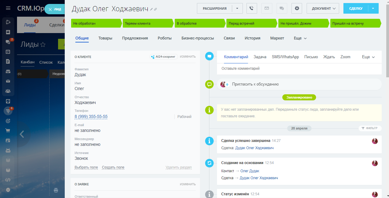 1. Не обработан - лид создан в системе вручную или из подключенного канала коммуникации, фиксируется дата и время прихода лида в систему. Через 15 минут стадия меняется на Теряем клиента.