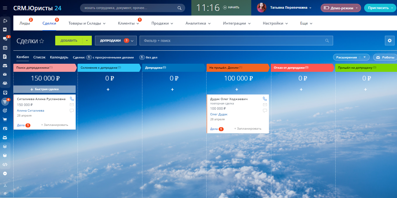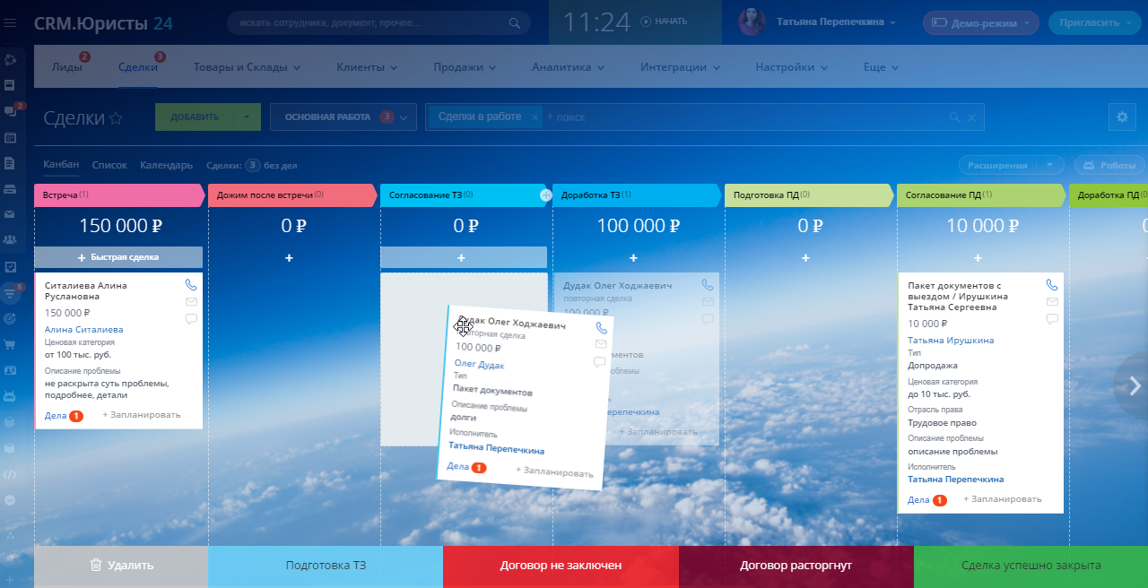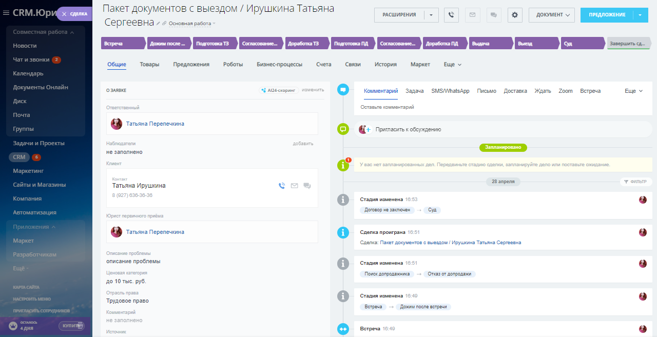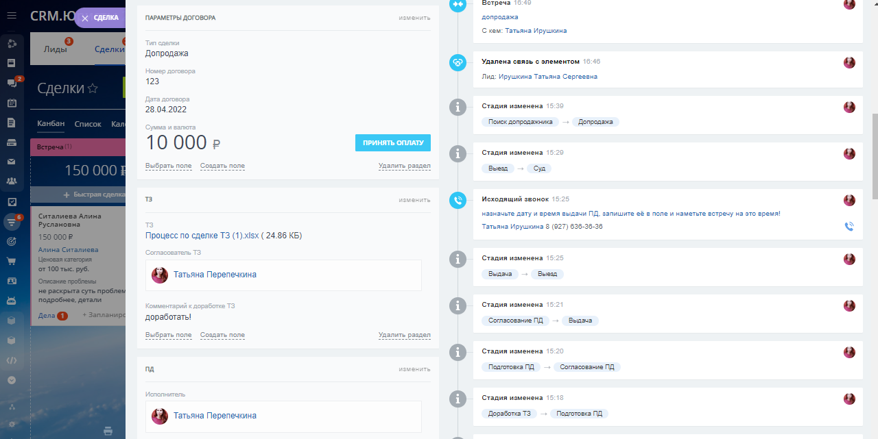 Для удобства работы настроен справочник Тип сделки: пакет документов, пакет документов с выездом, пакет документов с представительством в суде, допродажа и созданы пользовательские поля: Описание проблемы, Ценовая категория, Отрасль права, Юрист первичного приёма, Номер договора, Дата договора, ТЗ, Согласователь ТЗ, исполнитель, ПД, Согласователь ПД, Ответственный за выдачу, Выездник, судебный представитель, Акты, Причина отказа клиентом, Причина отказа нами и другие необходимые поля.