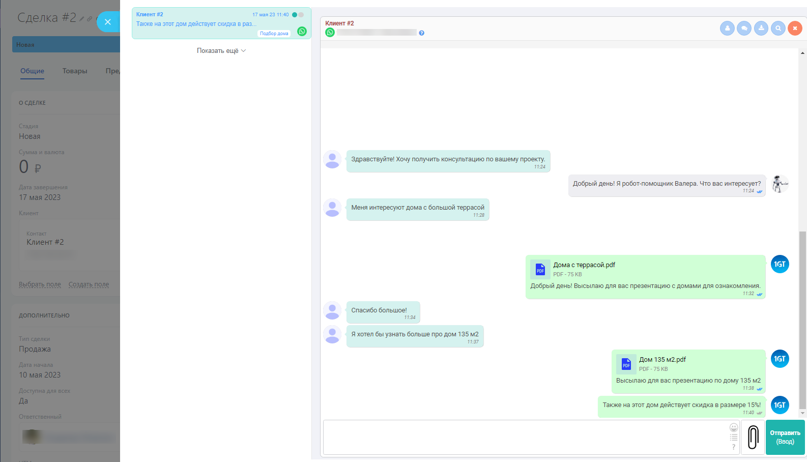 Переписка с клиентом ведется в сервисе Chat2Desk и автоматически передается в Битрикс24. Переписка переносится в карточку в виде комментария, со ссылкой на чат с этим клиентом в системе Chat2Desk.