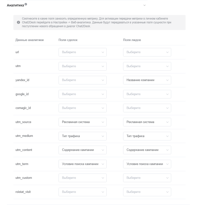 Приложение позволяет получать данные из систем аналитики и записывать в поля сущностей CRM: url, utm, yandex_id, google_id, comagic_id, roistat_visit.