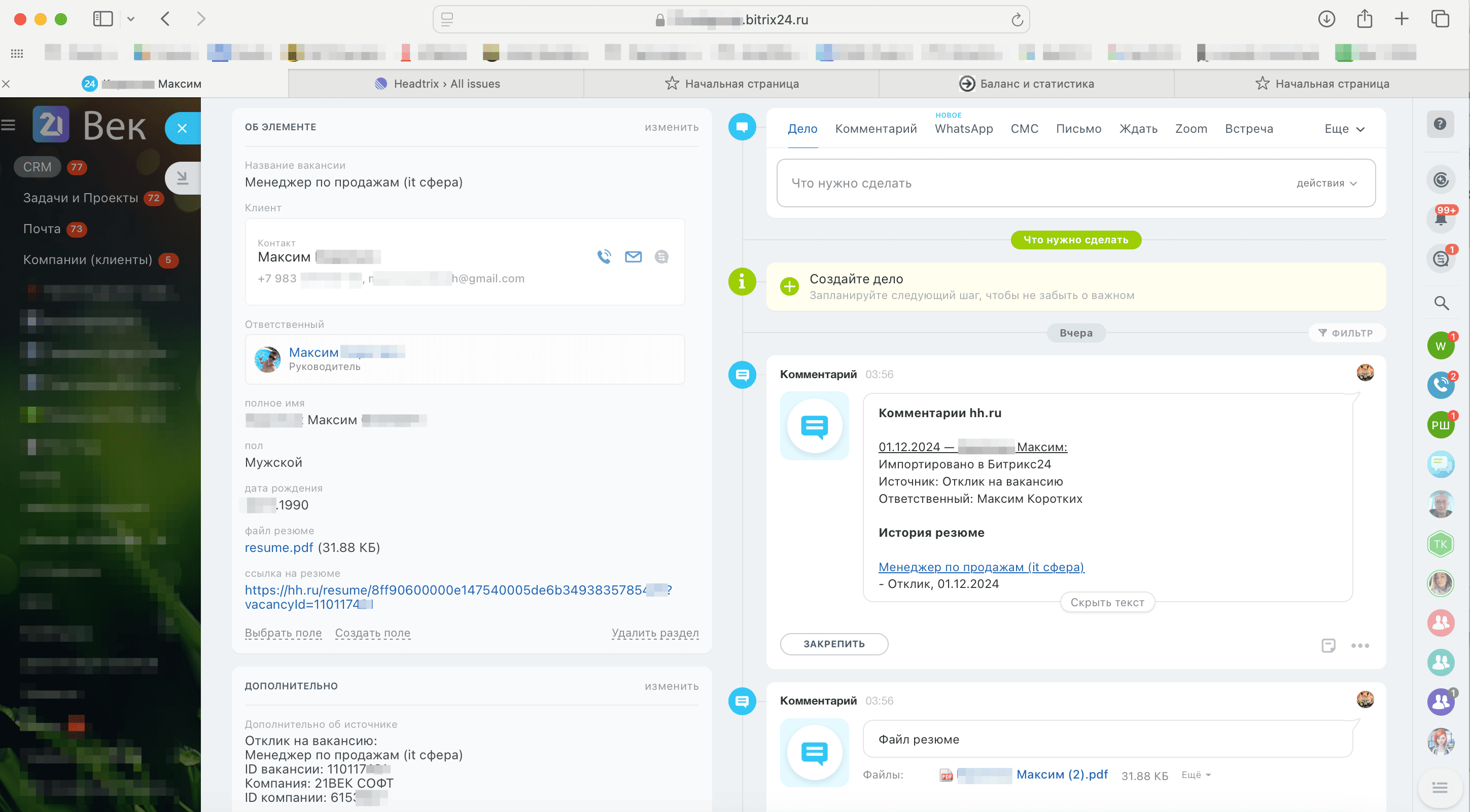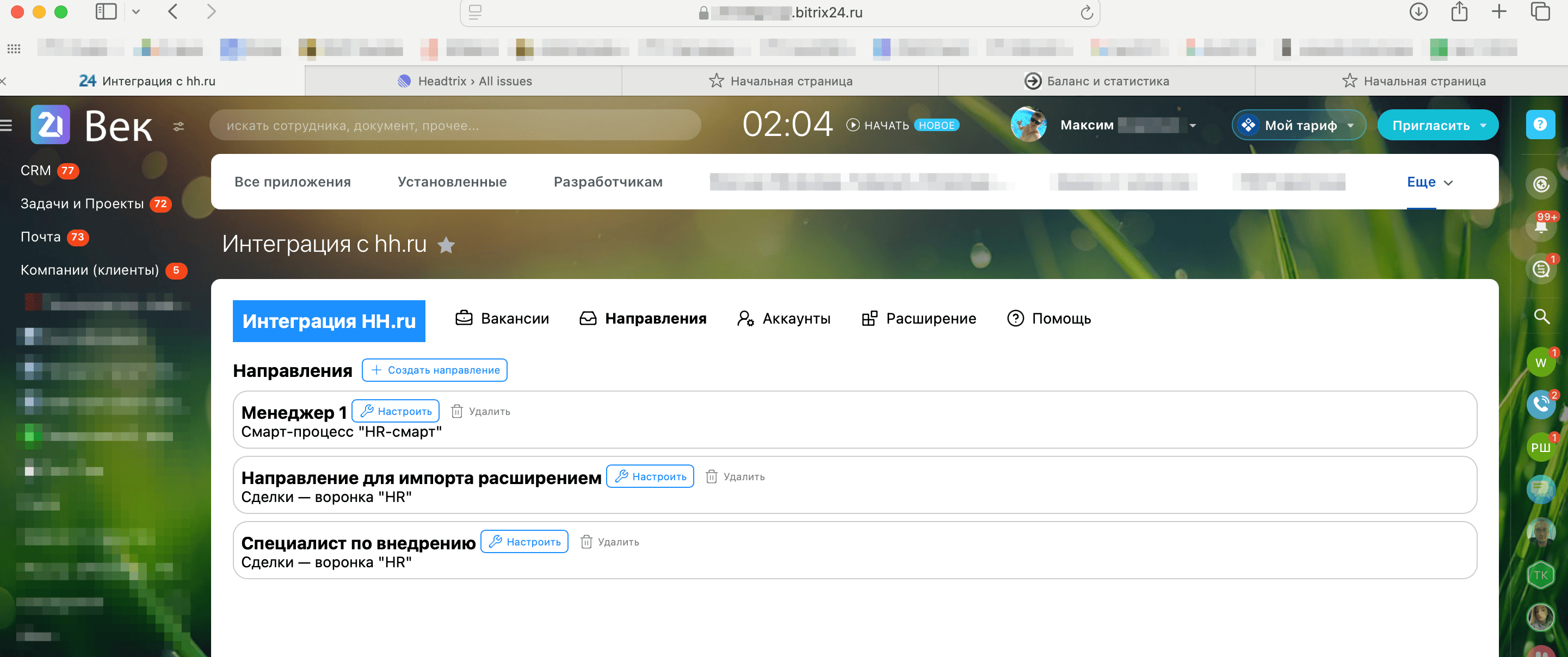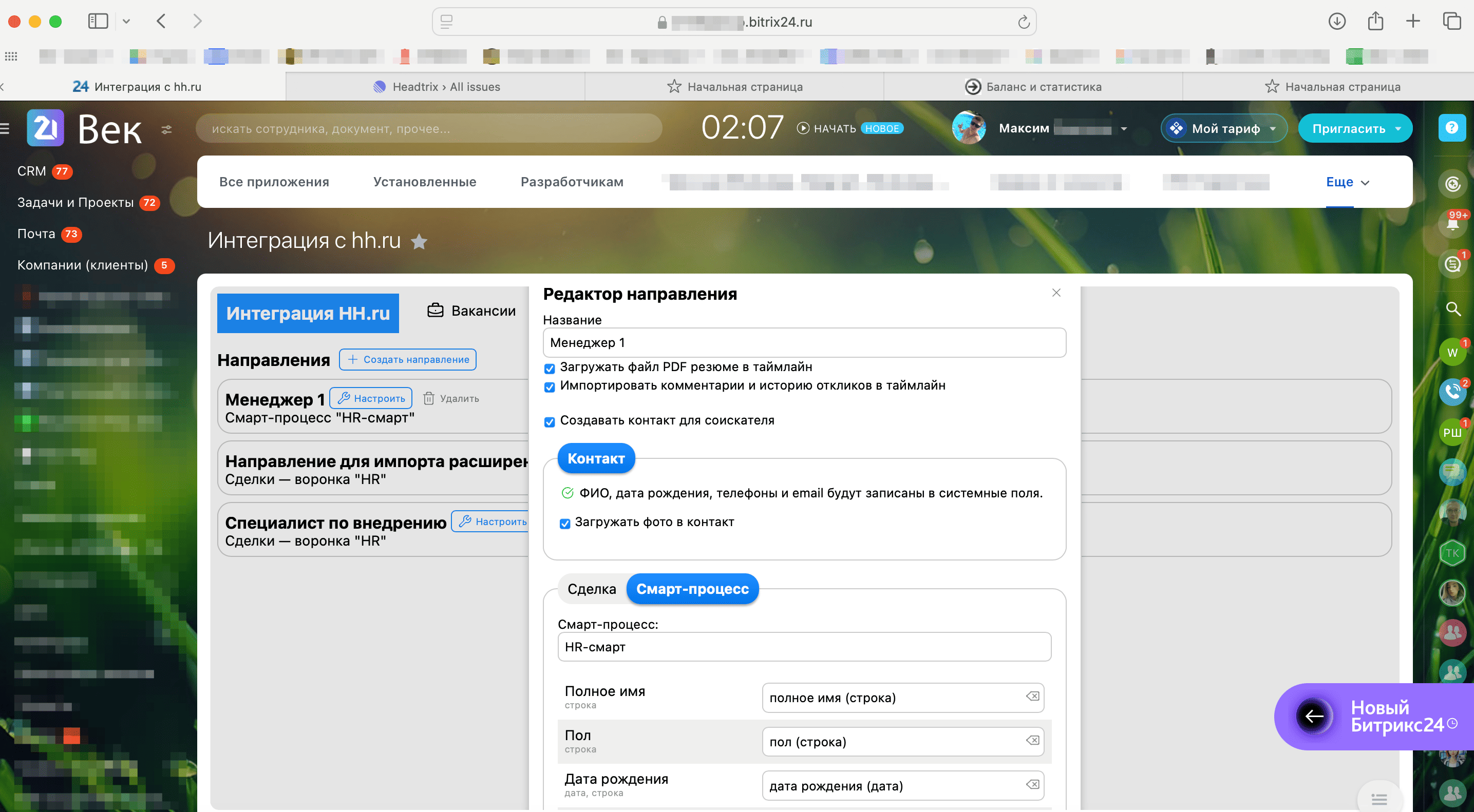 Отклики, резюме и кандидаты — прямо в CRM Битрикс24. Синхронизация с hh.ru: получение откликов, обновление стадий и статусов в обе стороны, поддержка смарт-процессов. Импорт архивных откликов и резюме, ручной импорт через расширение, автоматизация найма и удобная работа в одном окне.