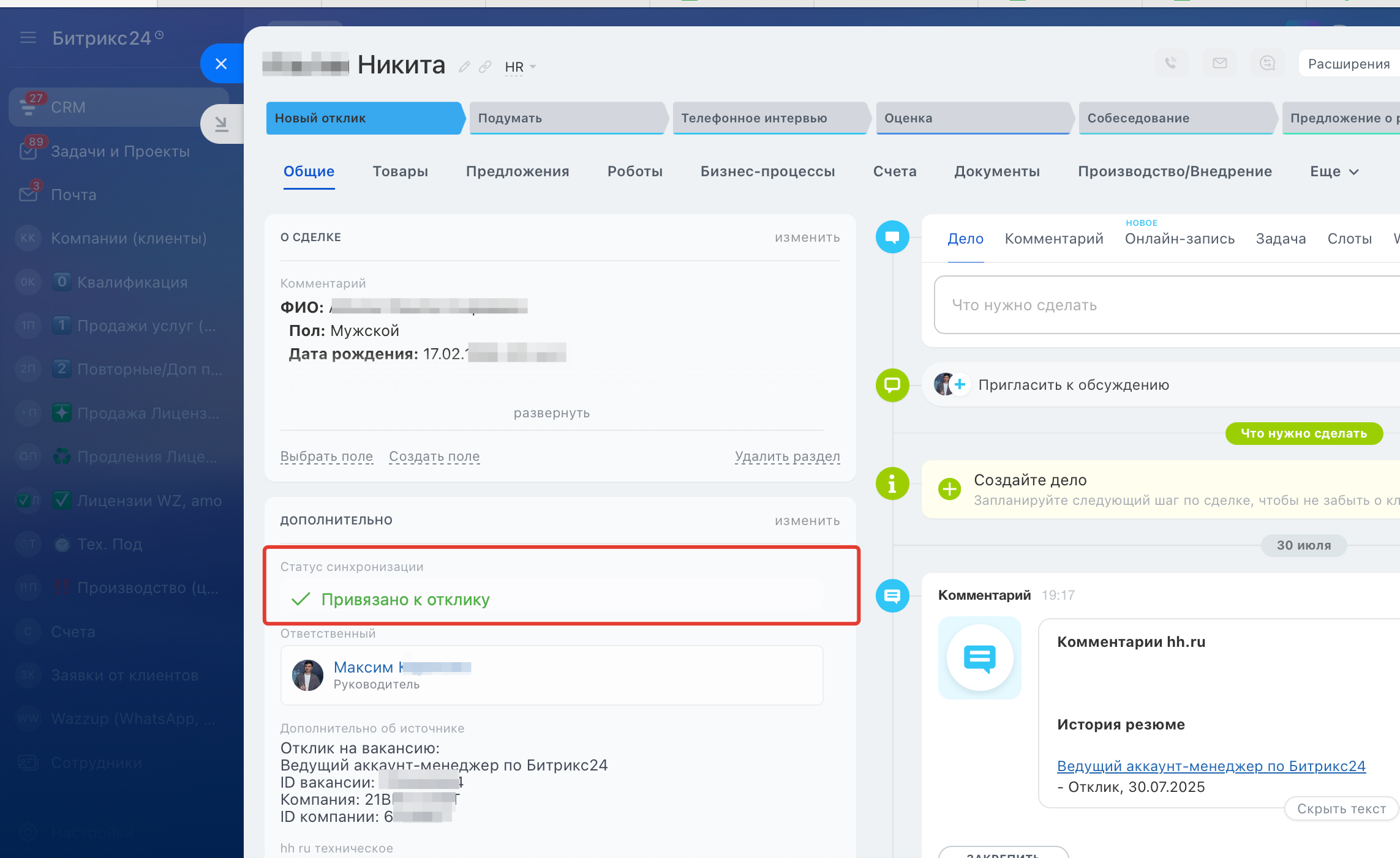 - Создание сделок или смарт-процессов при получении откликов на ваши вакансии.