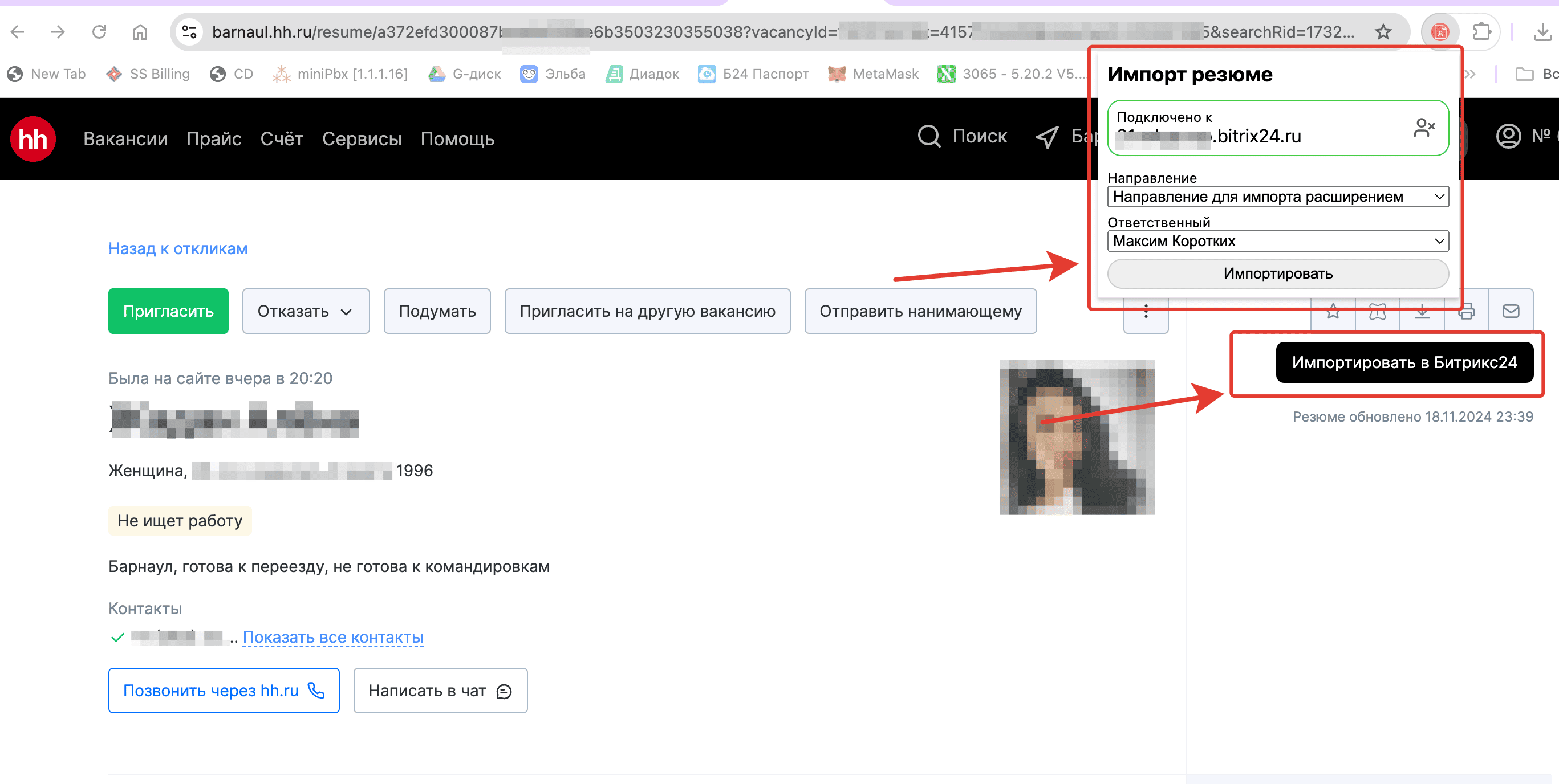 - Ручной импорт резюме в Битрикс24 с помощью расширения для браузера Google Chrome или Яндекс браузер без приглашения на вакансию.