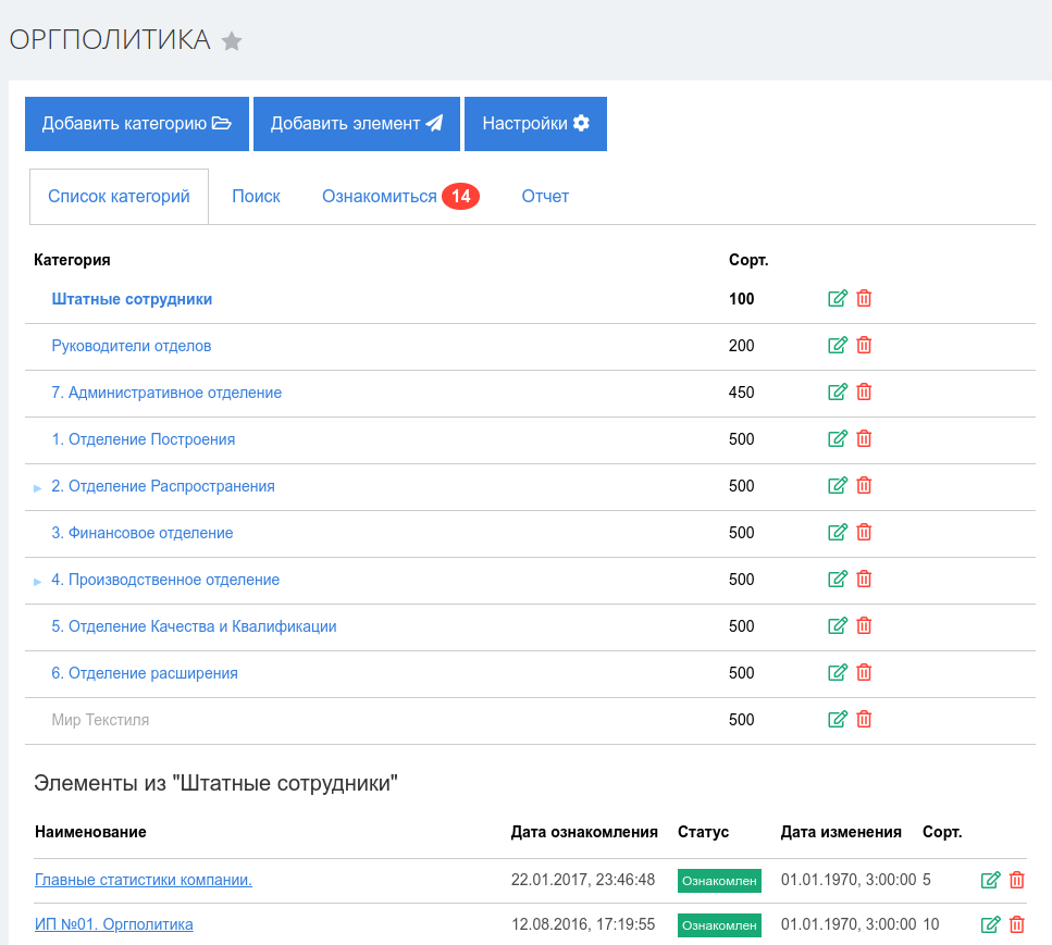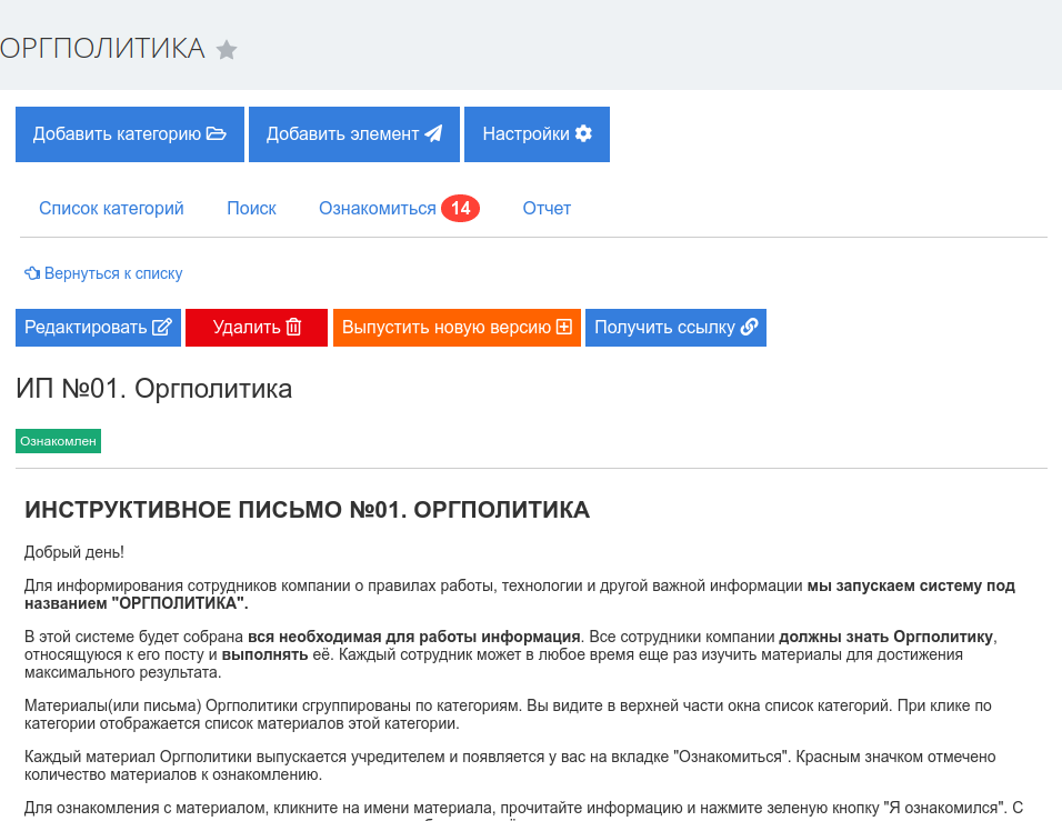 - Ознакомление с новой оргполитикой. У каждого пользователя в приложении есть закладка «Не ознакомлен», на которой выводятся все новые документы к ознакомлению. После прочтения пользователь нажимает кнопку «Ознакомлен» и документ помечается как прочитанный.