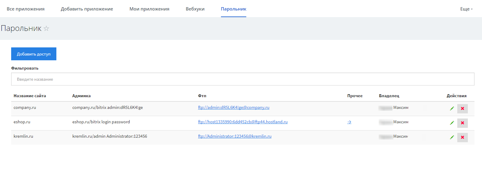 Пароли хранятся в защищенном облаке Битрикс24 на вашем портале в зашифрованном виде. Никто не имеет доступ к паролям – ни разработчики Битрикс24, ни разработчики ПАРОЛЬНИКА.