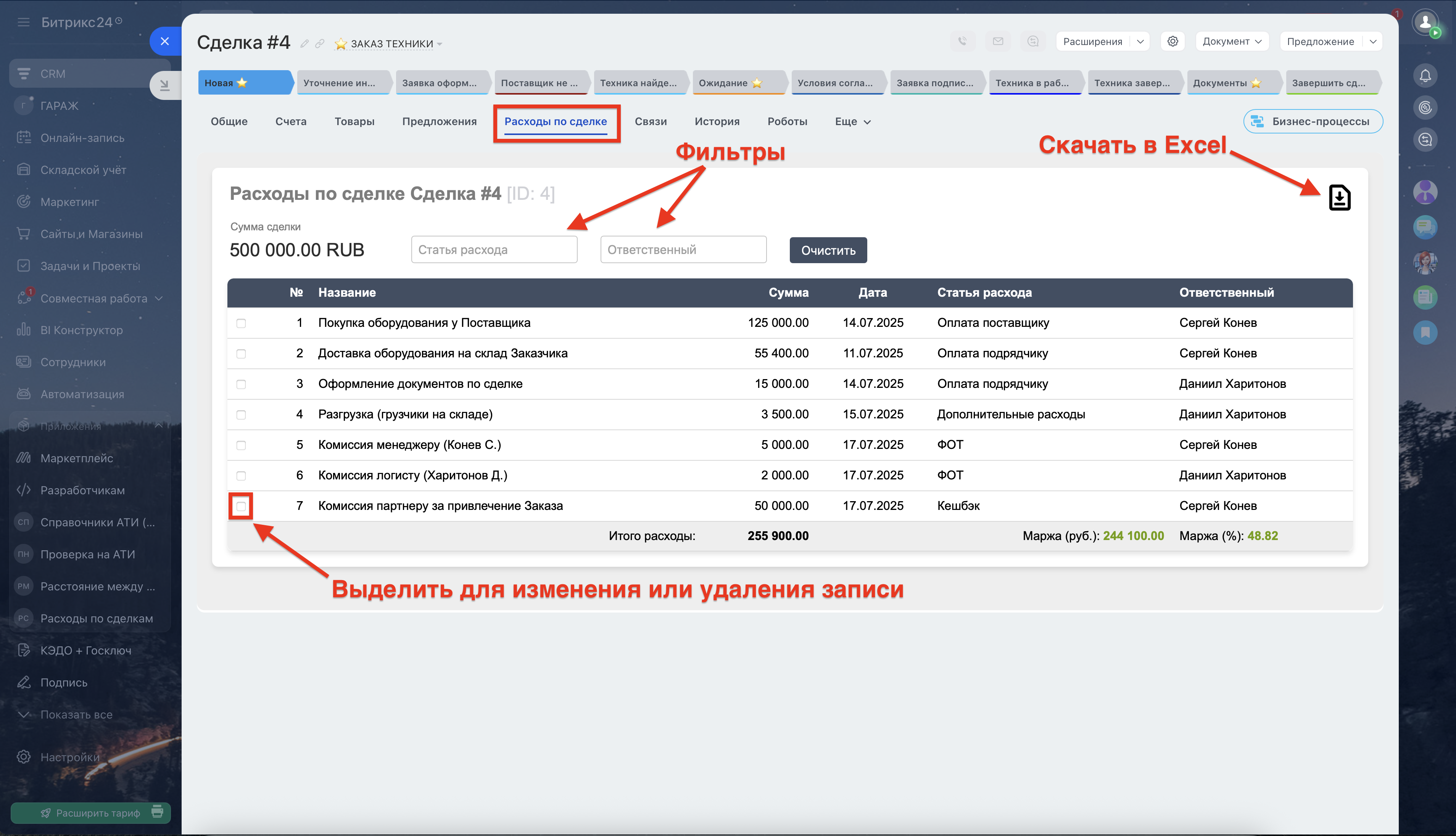 - Экспорт в Excel: Сохраняйте полную историю расходов для отчетов или дальнейшего анализа за пределами CRM.
