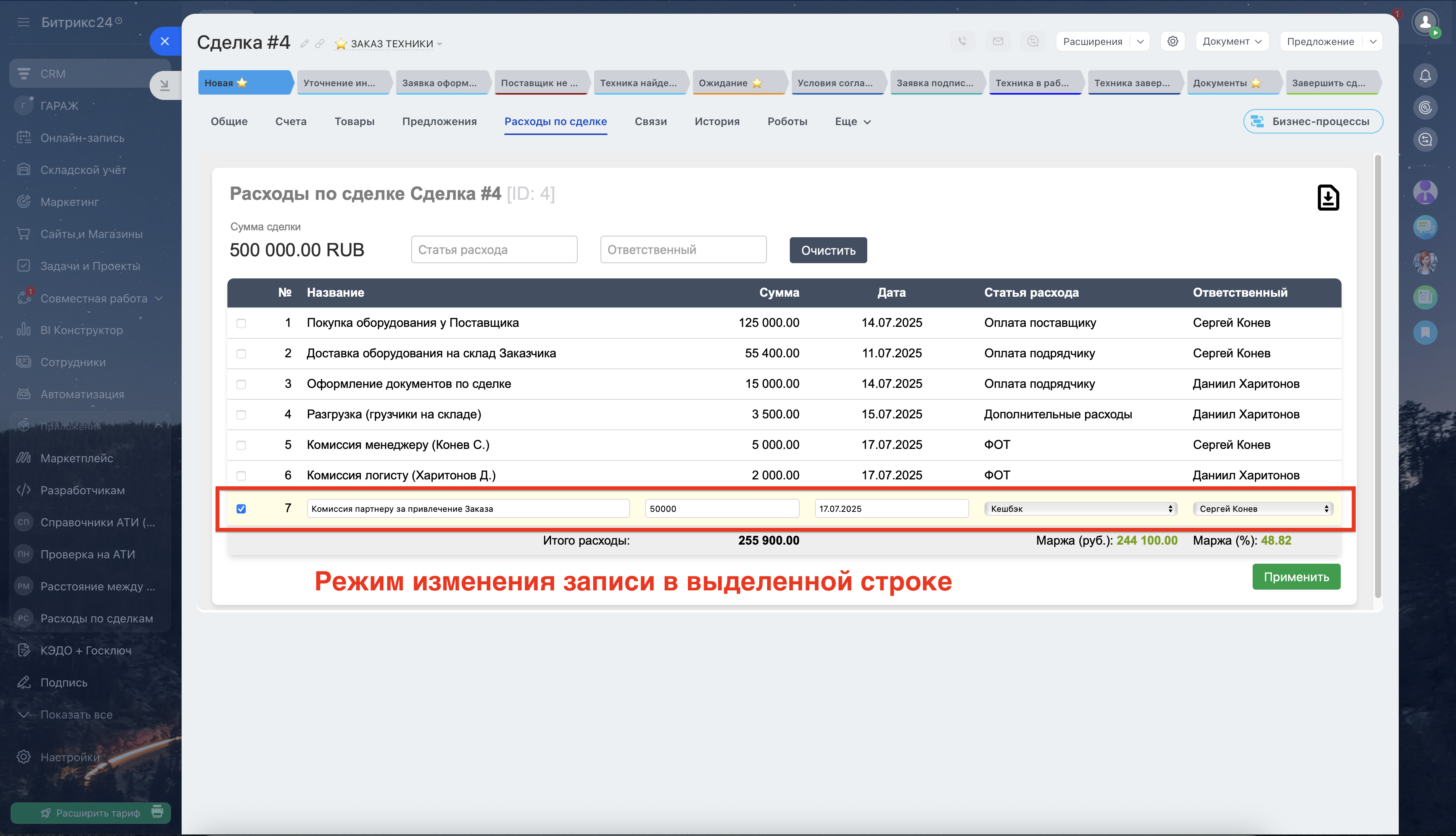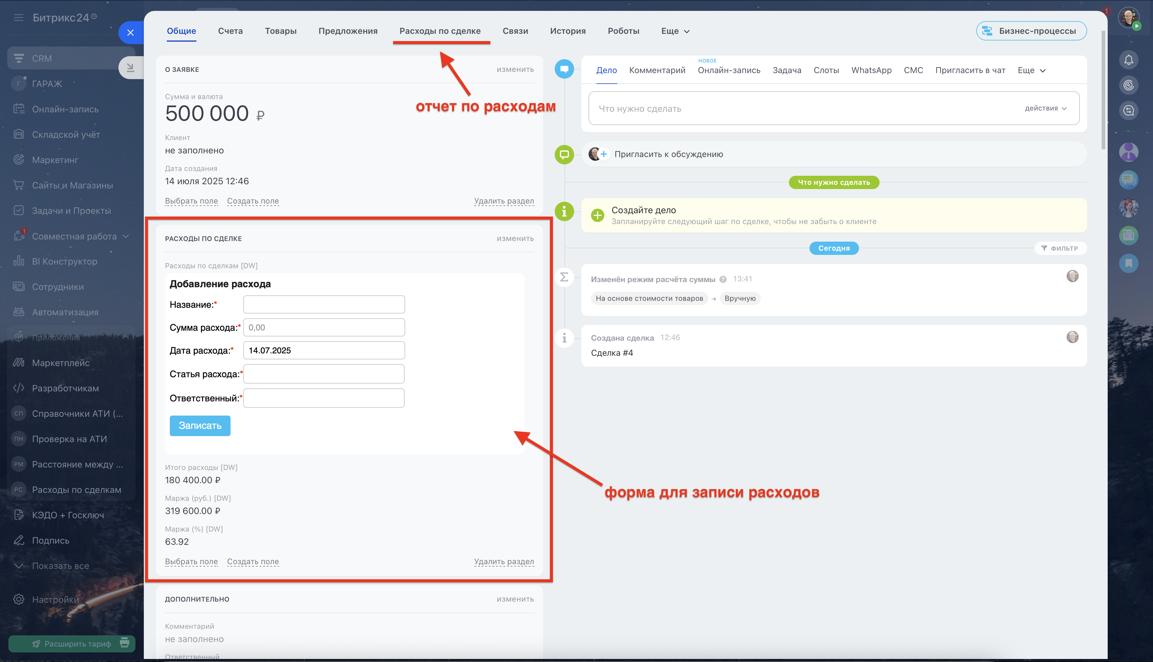 1. Легкая фиксация расходов: Прямо в основном разделе карточки сделки появится удобная форма для добавления расхода.Укажите: