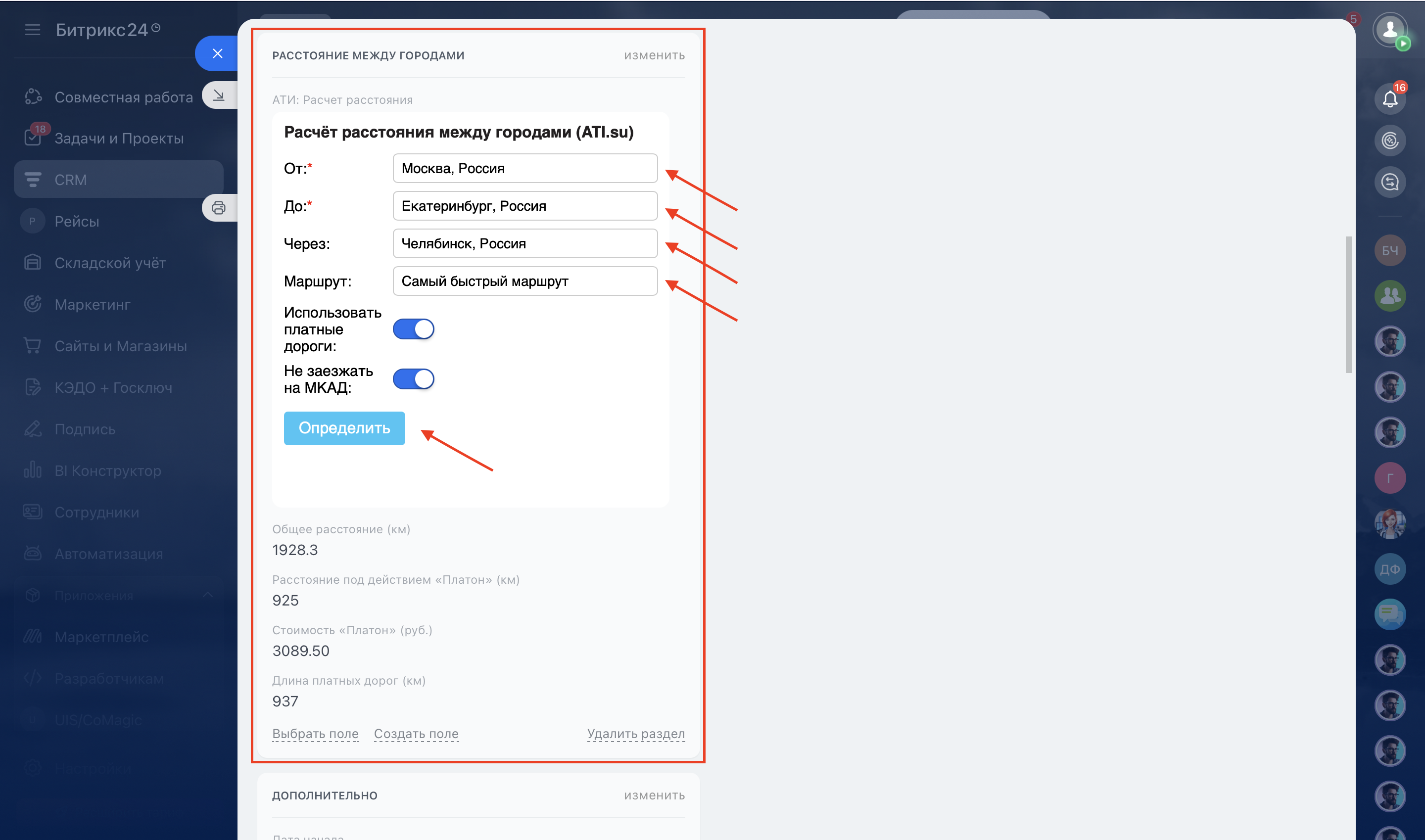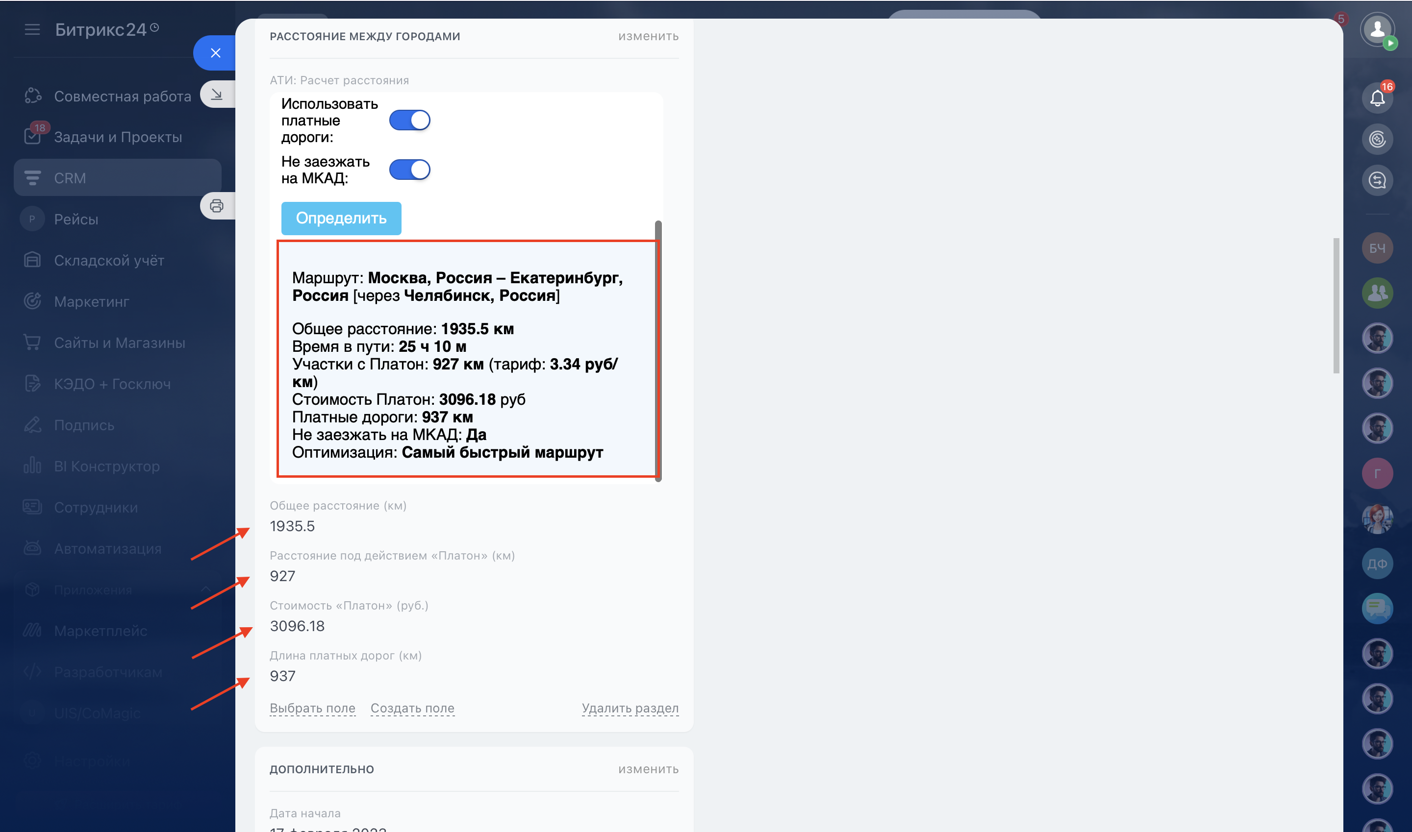 Расчет расстояний между городами в лидах и сделках. Расчет стоимости системы "Платон". Заполнение результата в поля лидов и сделок.
