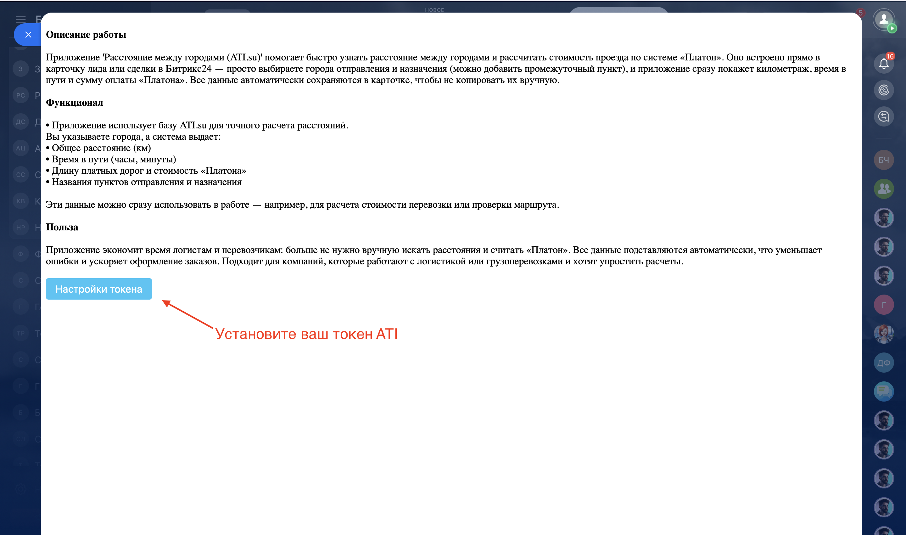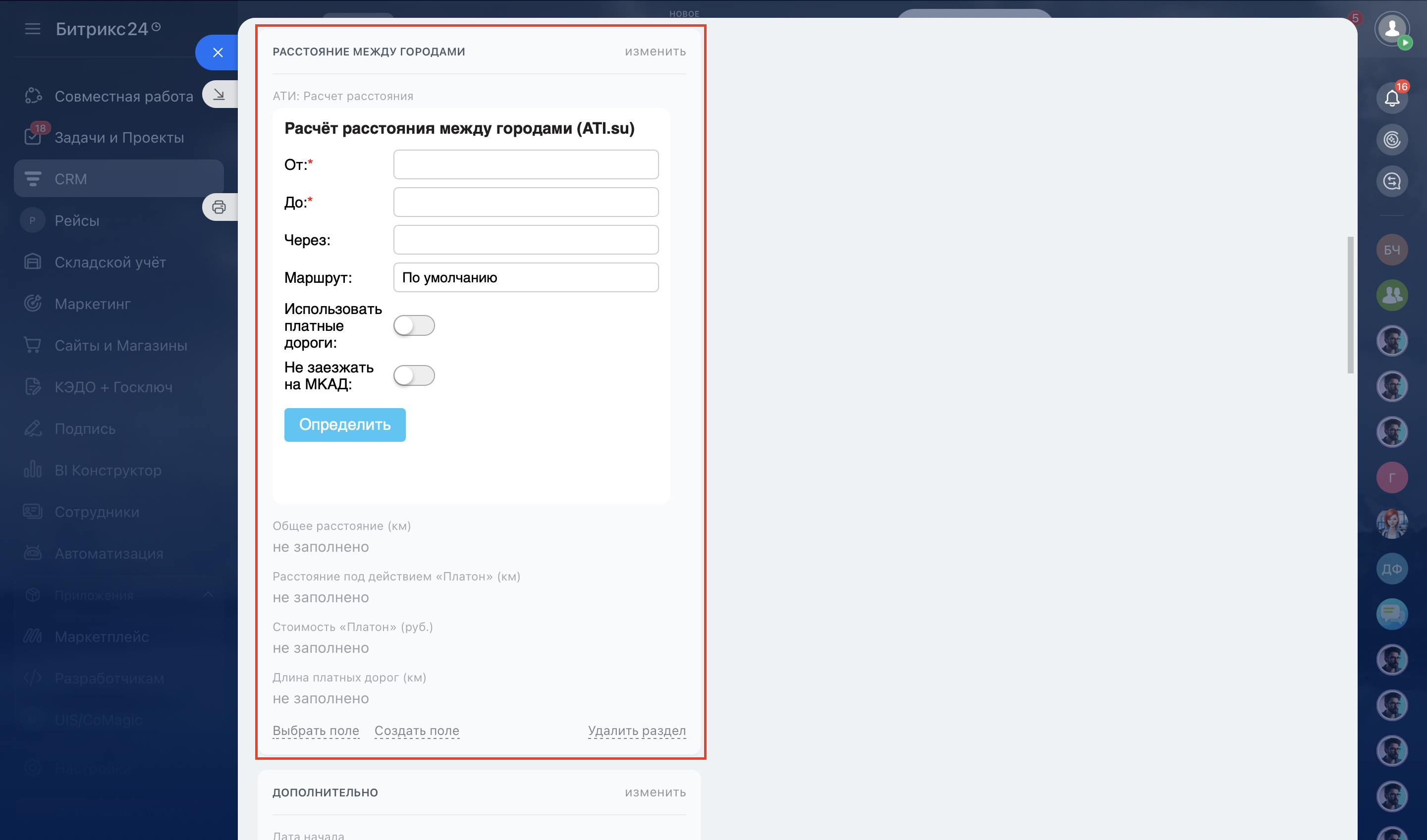 Приложение "Расстояние между городами (ATI.su)" помогает быстро узнать расстояние между городами и рассчитать стоимость проезда по системе «Платон». Оно встроено прямо в карточку лида или сделки в Битрикс24 — просто выбираете города отправления и назначения (можно добавить промежуточный пункт), и приложение сразу покажет километраж, время в пути и сумму оплаты «Платона». Все данные автоматически сохраняются в карточке, чтобы не копировать их вручную.