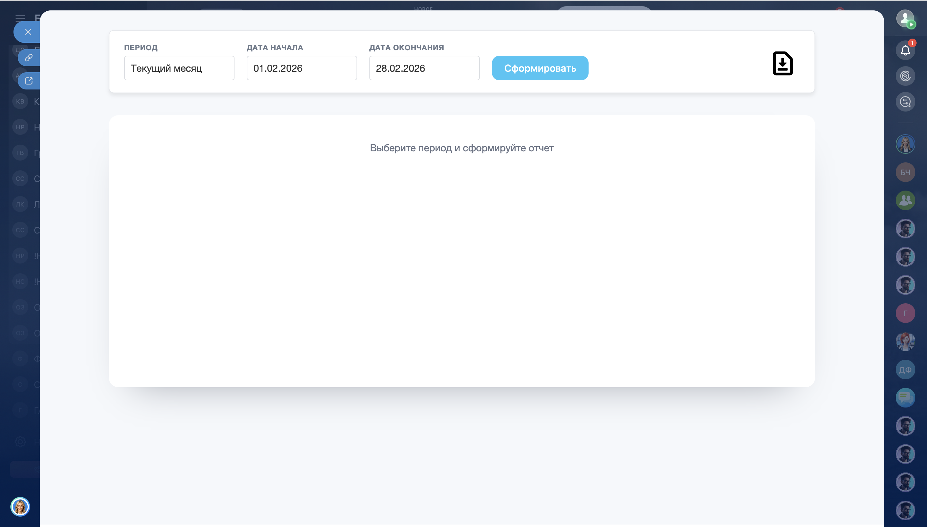 • Гибкая фильтрация по периодам и сотрудникам позволяет использовать приложение как оперативный дашборд и как инструмент для подготовки отчетности.