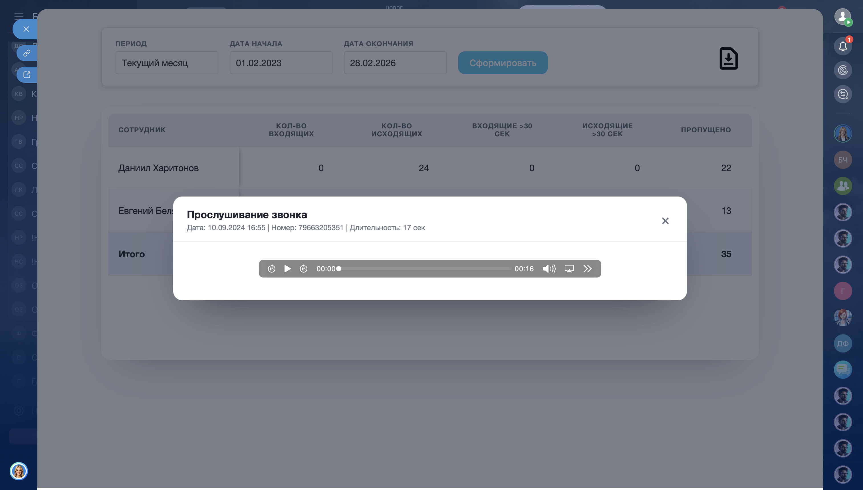 • Возможность прослушать запись конкретного звонка прямо из отчета (при наличии записи в телефонии).