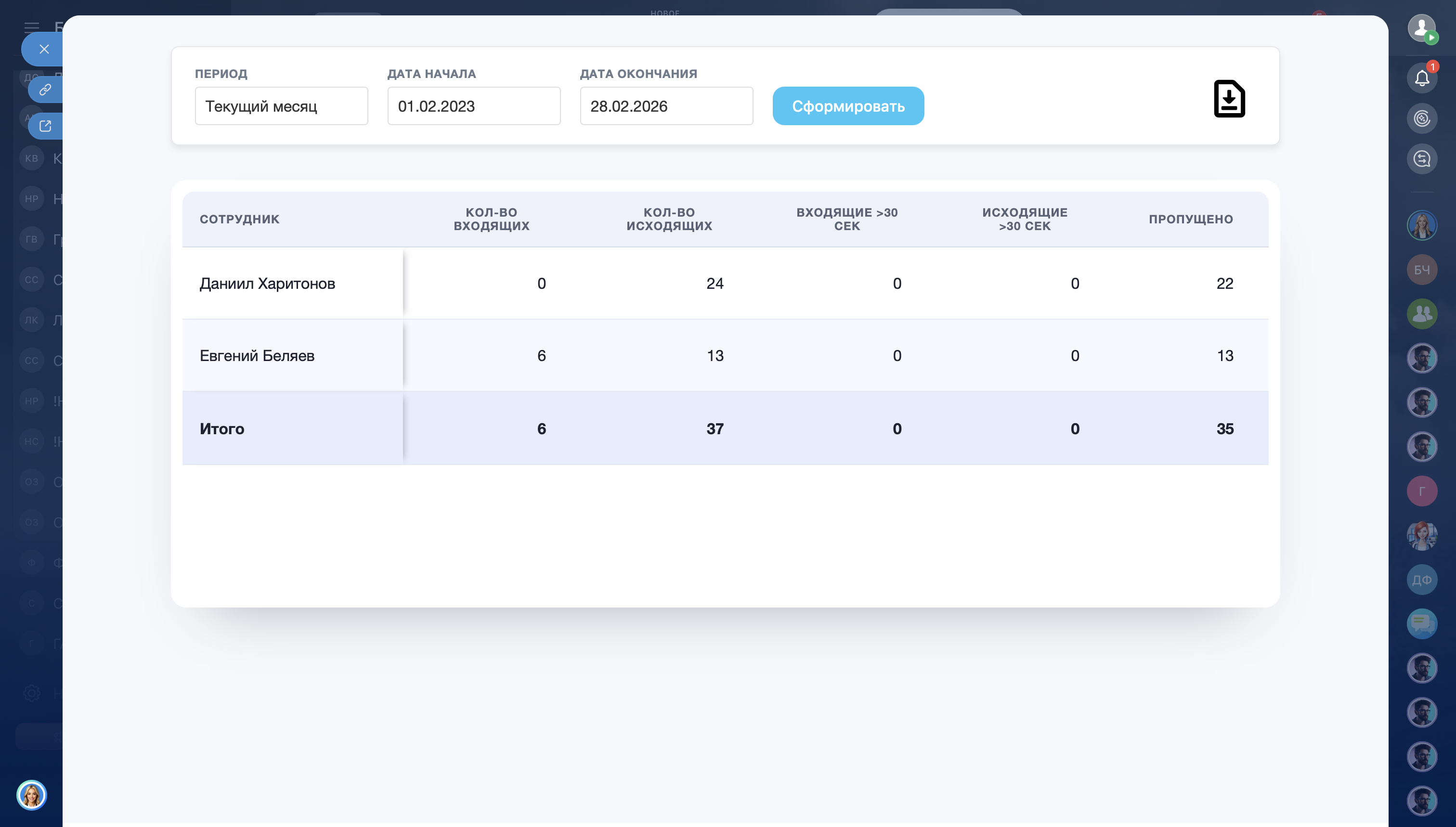 • Детализация по сотрудникам: количество входящих, исходящих и пропущенных звонков по каждому менеджеру.