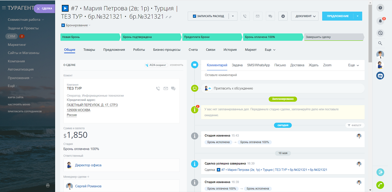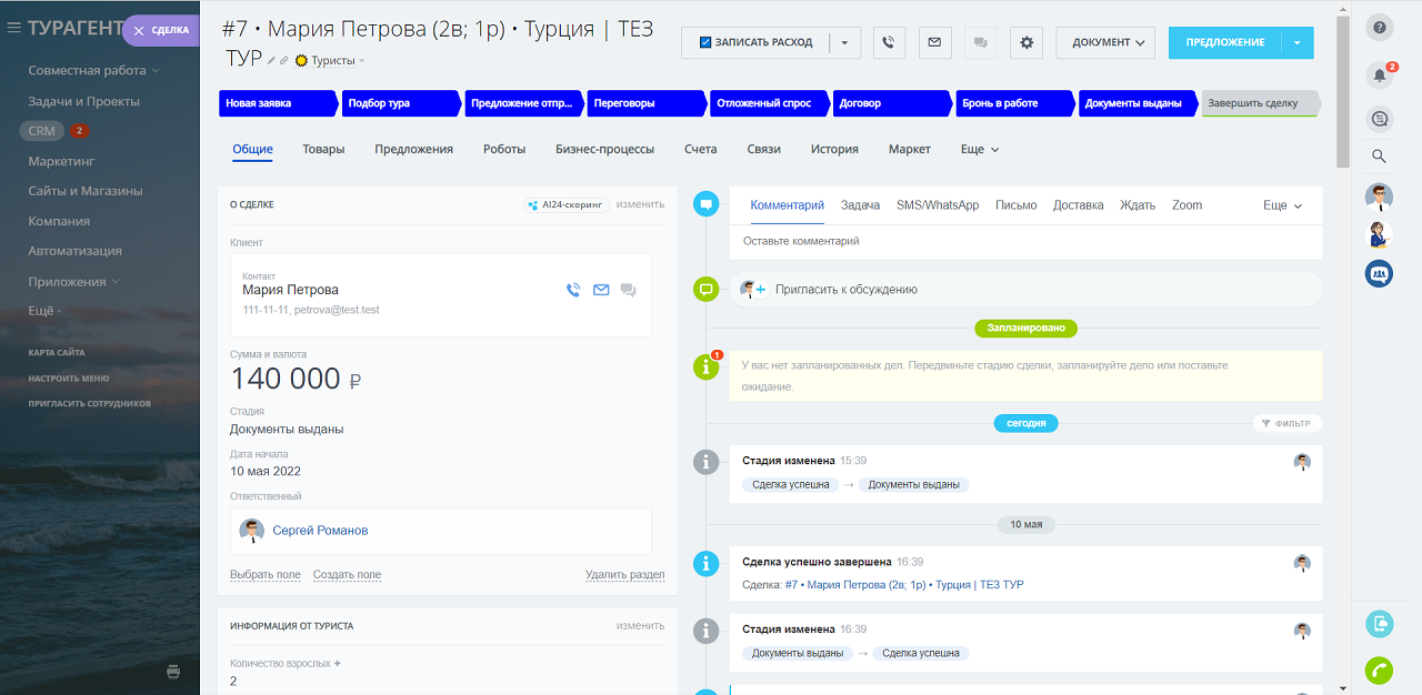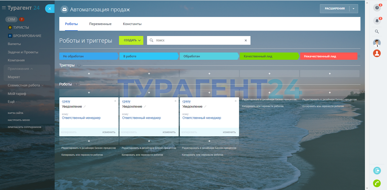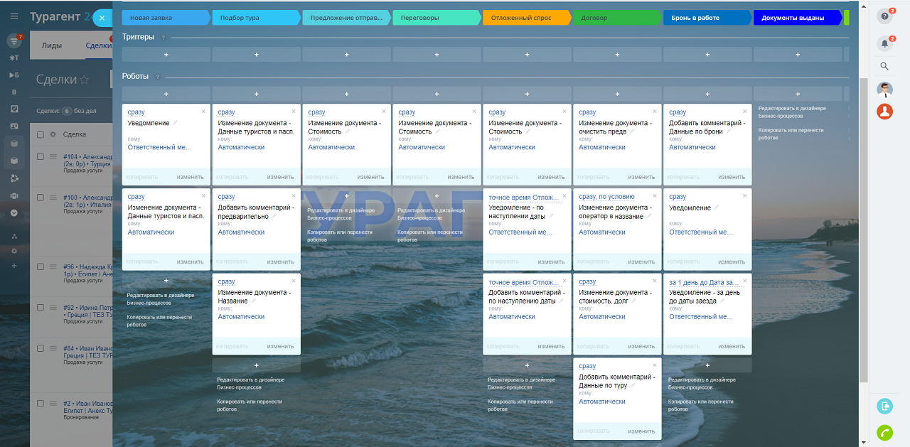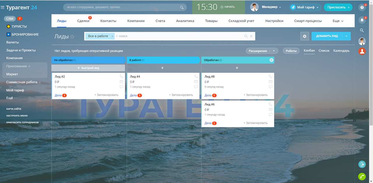 Турагент24 - это максимально простая и комфортная CRM для работы турагентства на платформе Битрикс24. Отраслевая CRM подходит для работы как больших, так и маленьких турагентств. Весь функционал доступен уже с тарифа Базовый и выше.