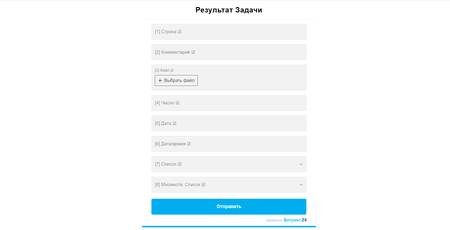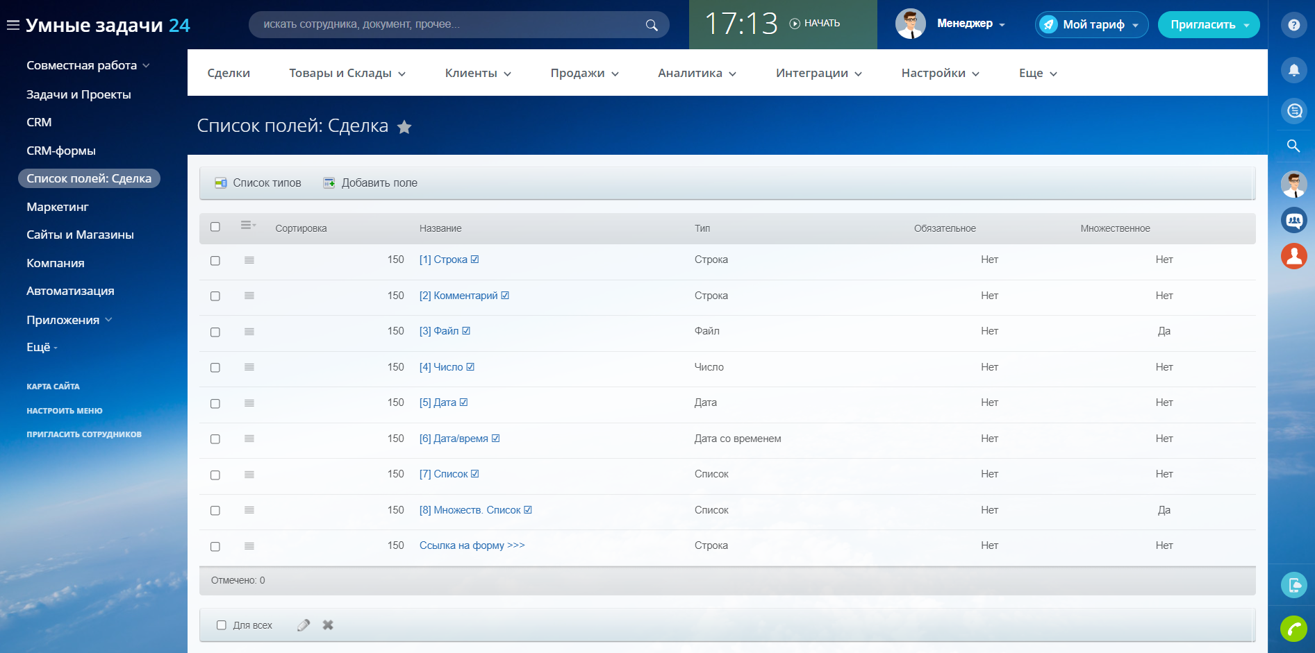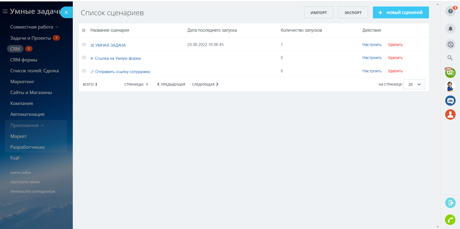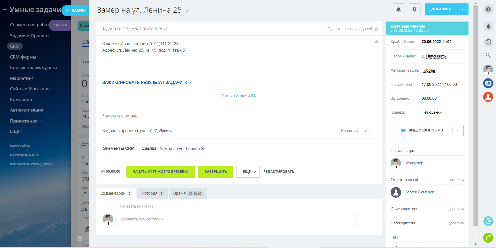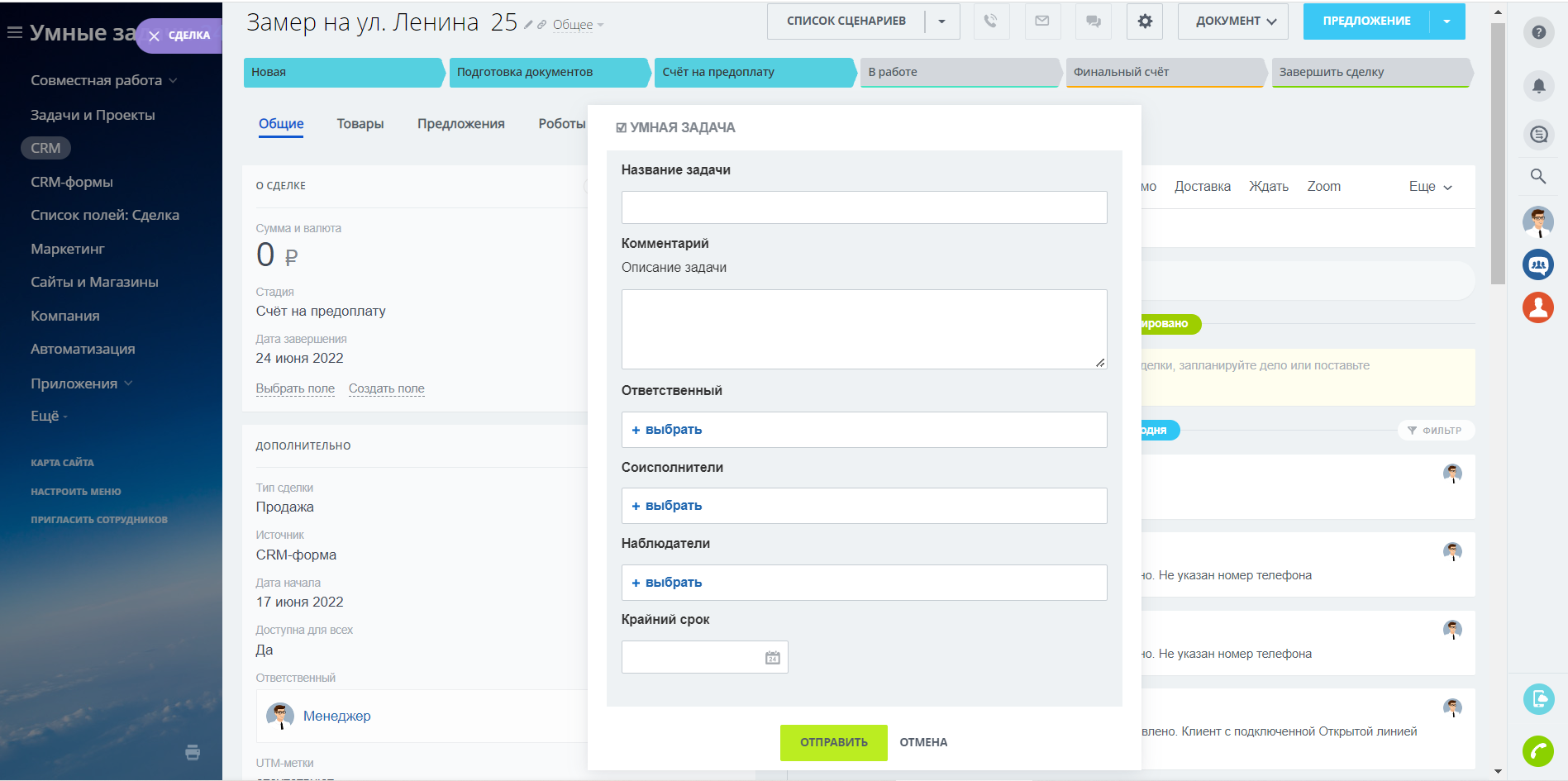 - ☑ УМНАЯ ЗАДАЧА - сценарий создаёт Задачу (привязанную к Сделке). Из этой Задачи ответственный может передавать в поля Сделки данные (файлы, даты, суммы и др.)