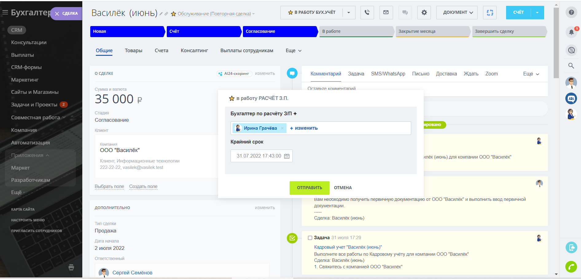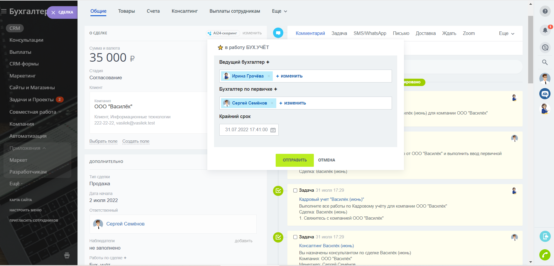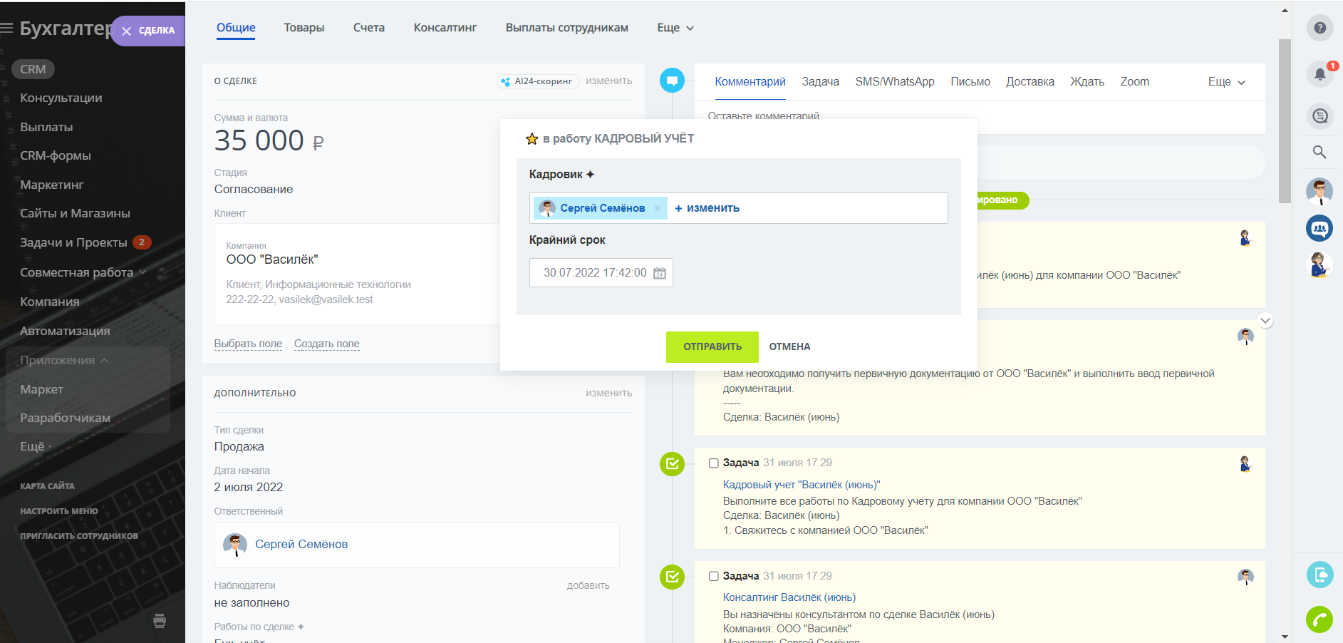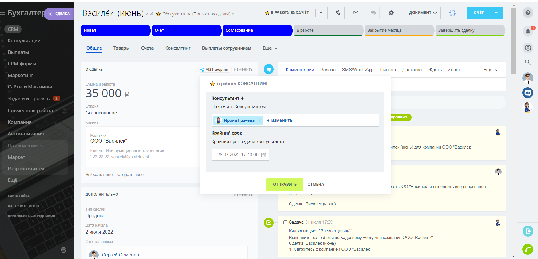 - ⭐️ в работу КОНСАЛТИНГ - сценарий создаёт задачу сотруднику на консалтинговое сопровождение клиента по сделке.
