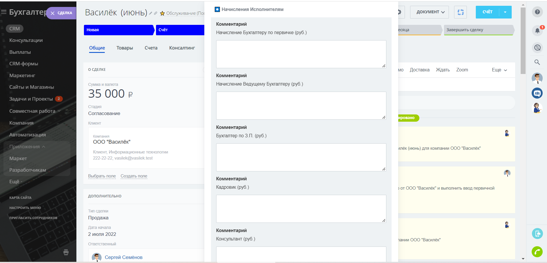 - ⏺ Начисления Исполнителям - сценарий записывает данные в числовые поля сделки (суммы выплат исполнителям по сделке).