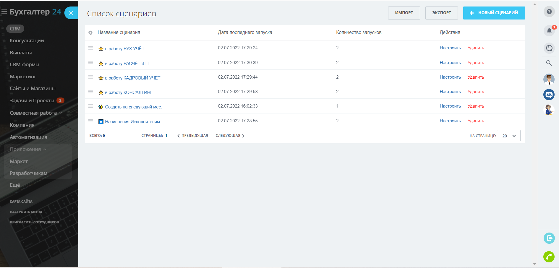 Умные сценарии для автоматизации отраслевой CRM "Бухгалтер24: CRM для бухгалтерии". Приложение является дополнением и работает только вместе с отраслевой CRM.