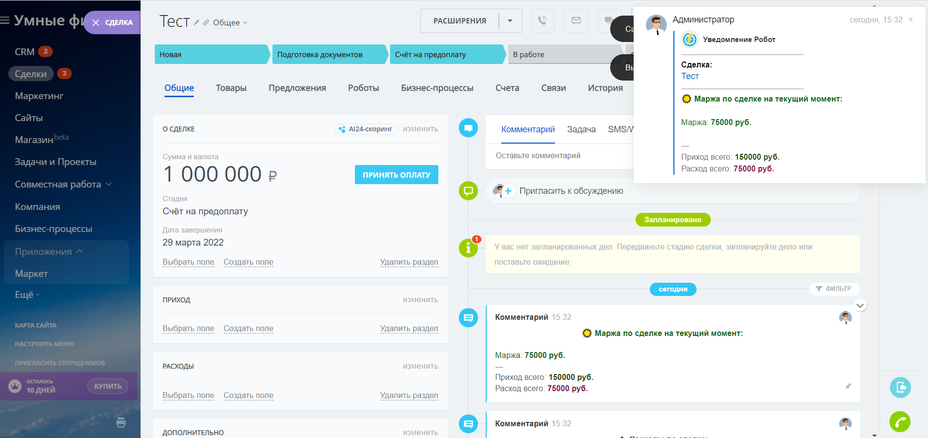 - ☀️ Показать МАРЖУ - сценарий выполняет расчет "Маржи по сделке" (как разницу между суммой приходов и расходов). Выводит информацию "Маржа по сделке" в комментарий и в уведомление.