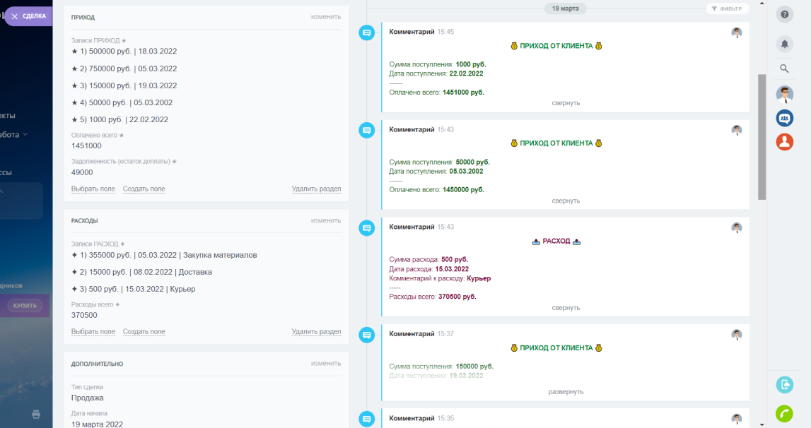 ПРИХОД / РАСХОД / МАРЖА. Запись приходов и расходов в сделках. Вычисление задолженности и суммы расходов. Расчет Маржи по сделке.