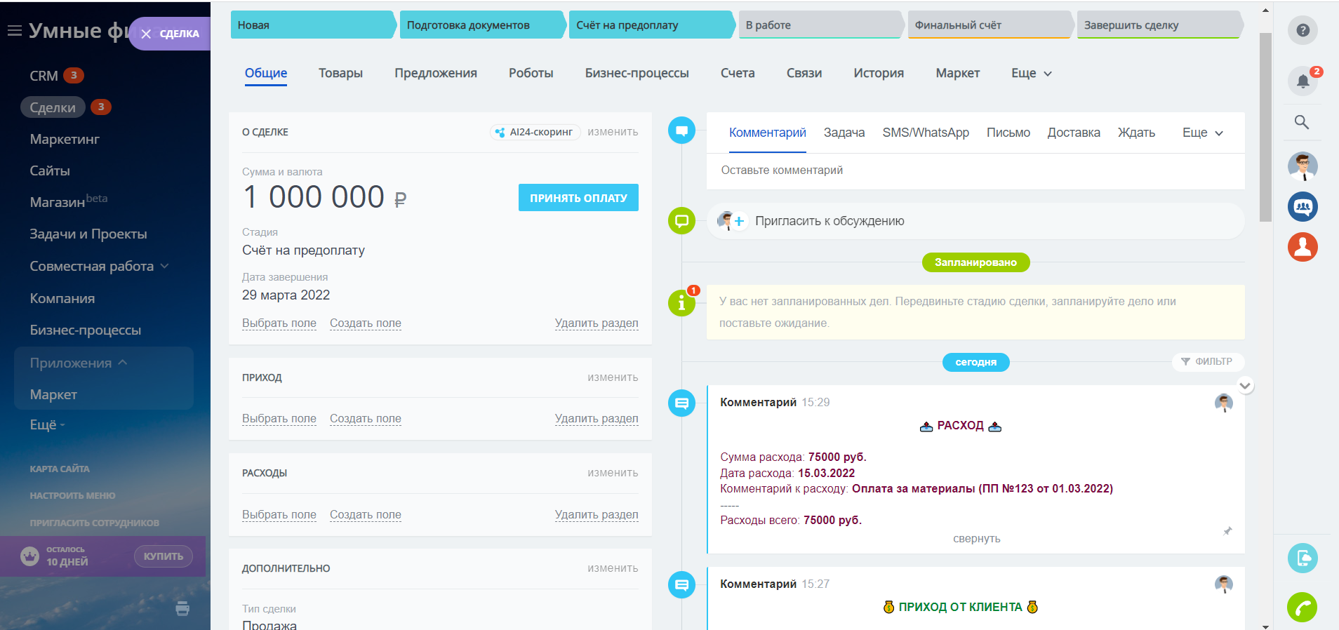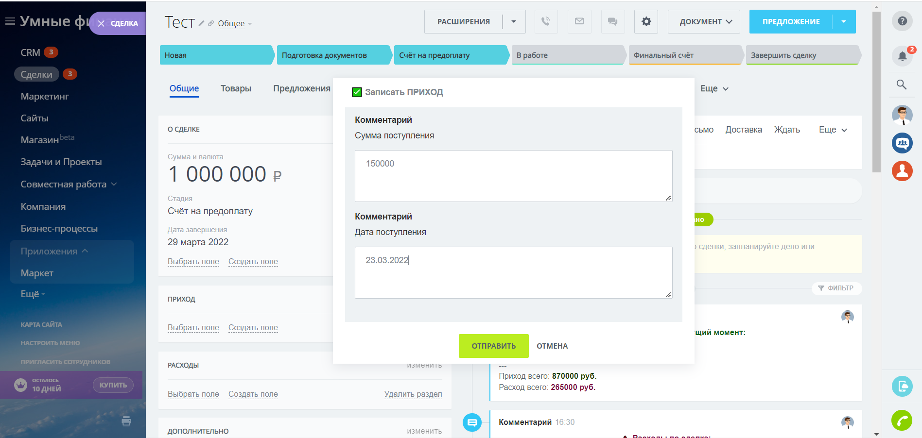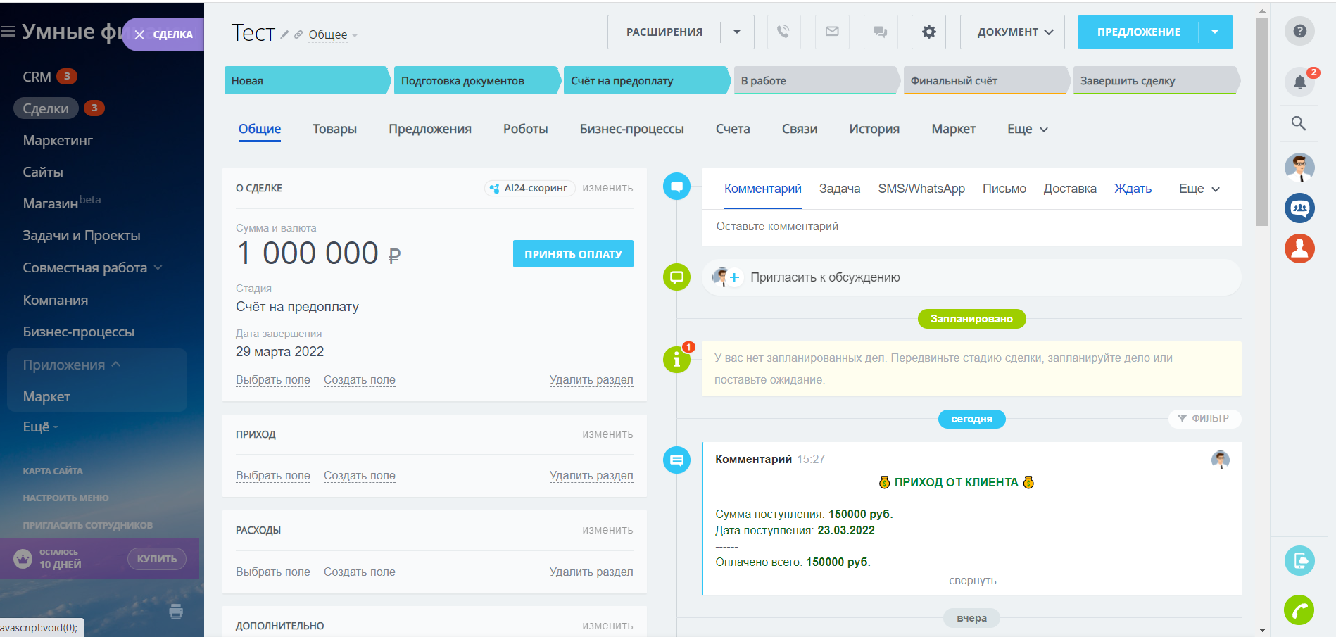 - ✅ Записать ПРИХОД - сценарий записывает сумму и дату прихода в сделку. Вычисляет сумму "Оплачено всего" и "Задолженность (остаток доплаты)". Выводит в комментарий информацию о приходе.