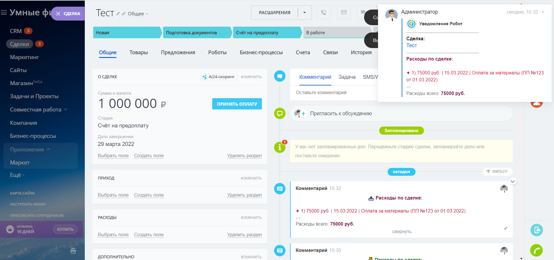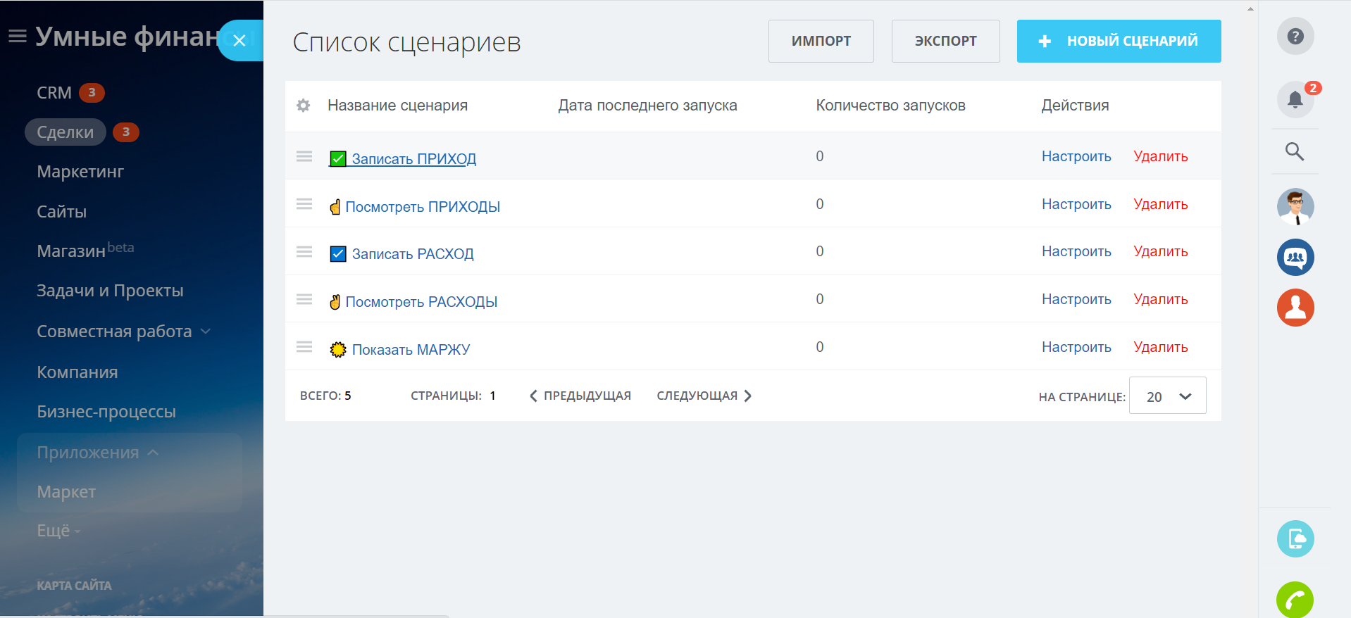 - ☑️ Записать РАСХОД - сценарий записывает в сделку сумму, дату и комментарий к расходу. Вычисляет сумму "Расходы всего" и выводит в комментарий информацию о расходе.