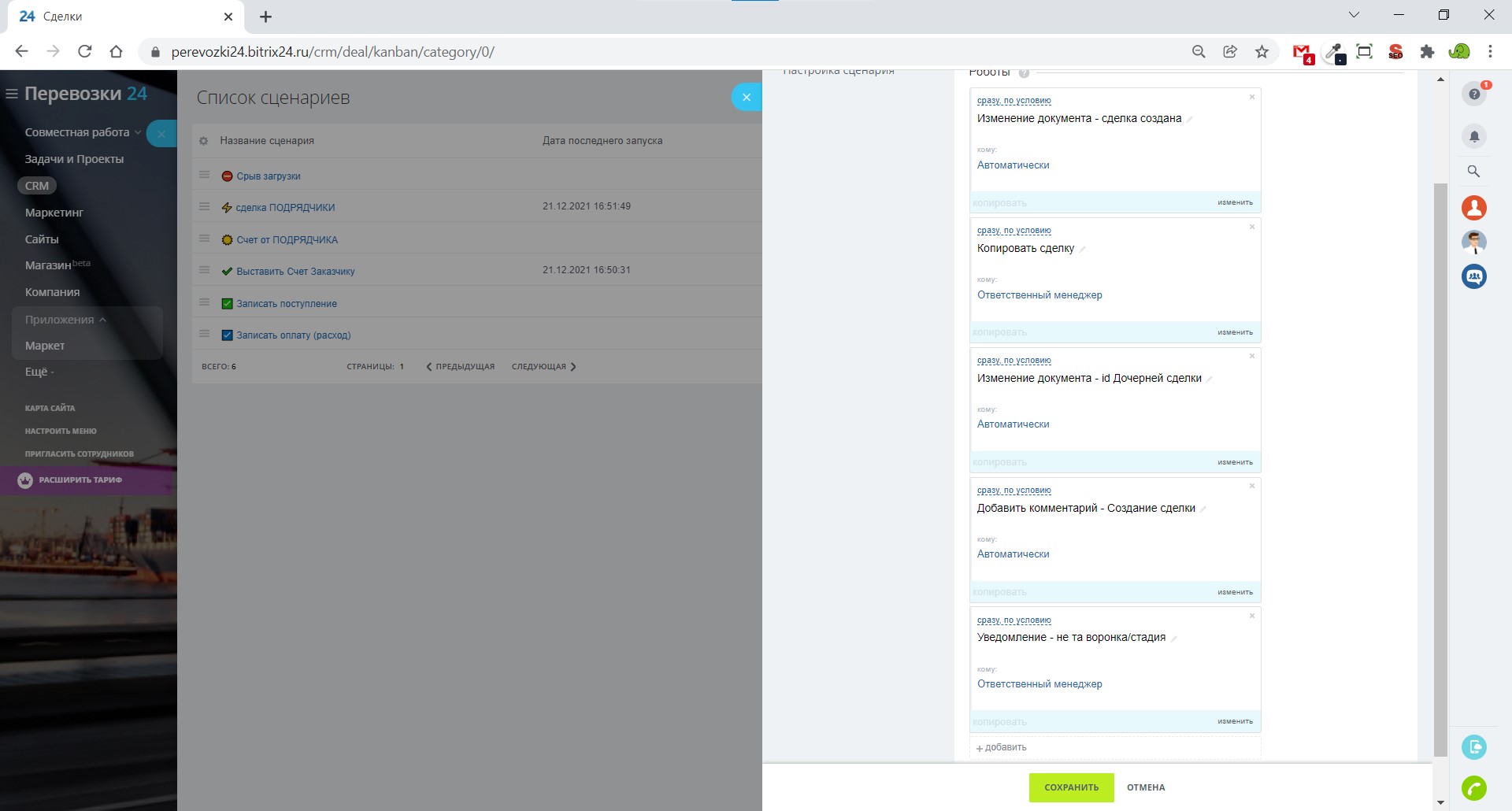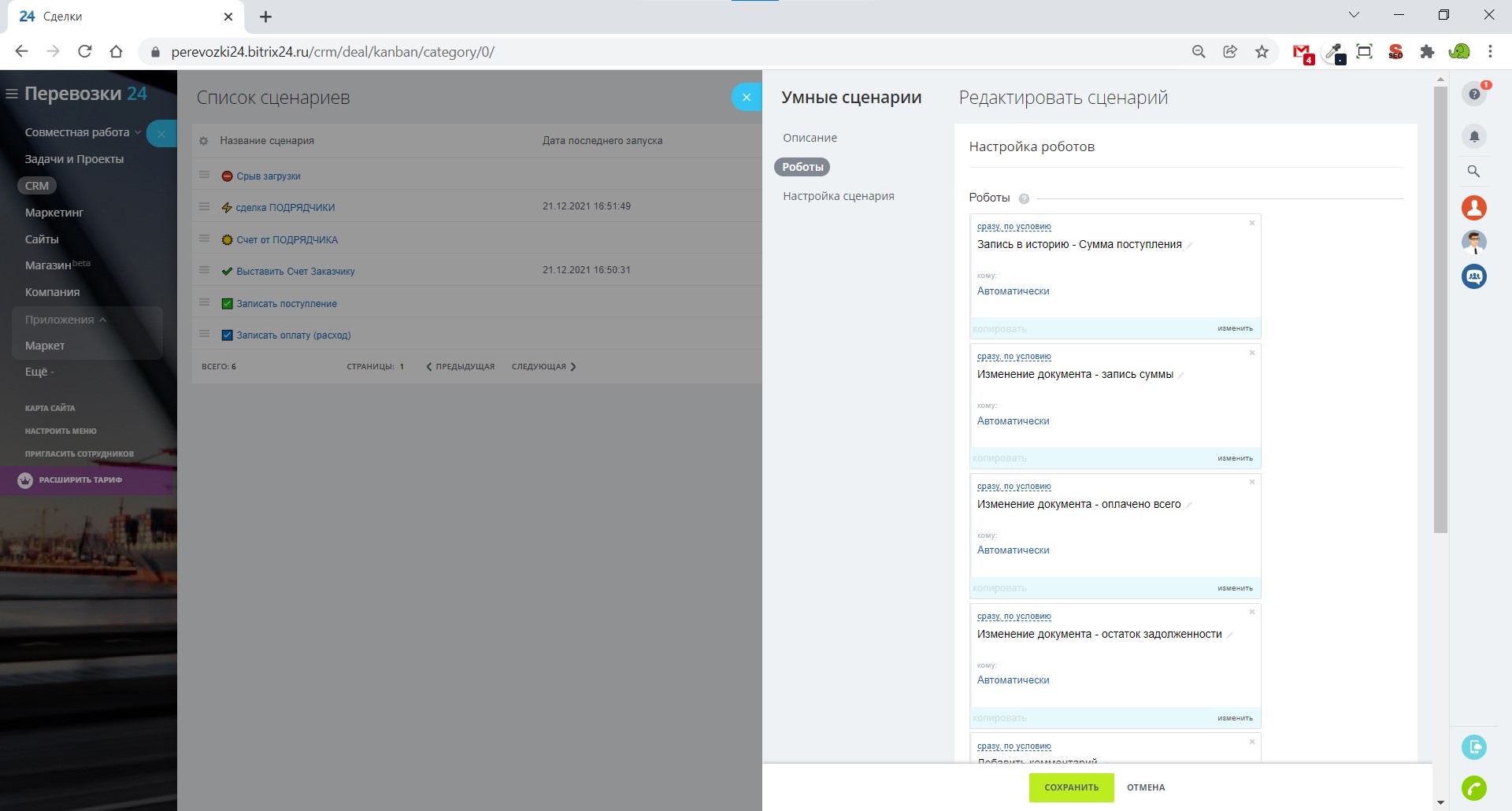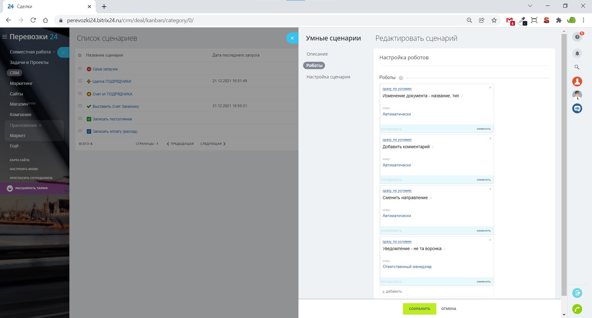 Умные сценарии для отраслевой CRM "Логистика24: CRM для грузоперевозок". Дополнение для автоматизации работы в CRM Логистика24. Работает только в установленной отраслевой CRM.