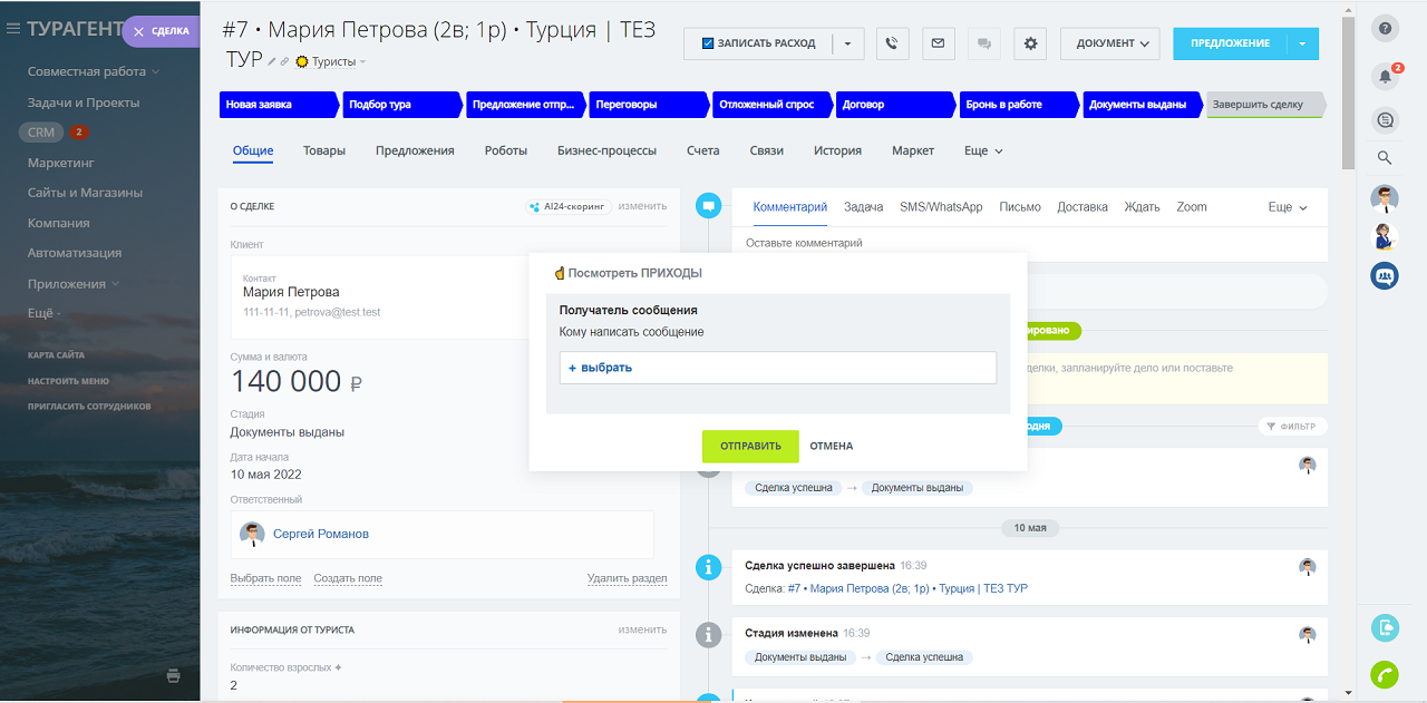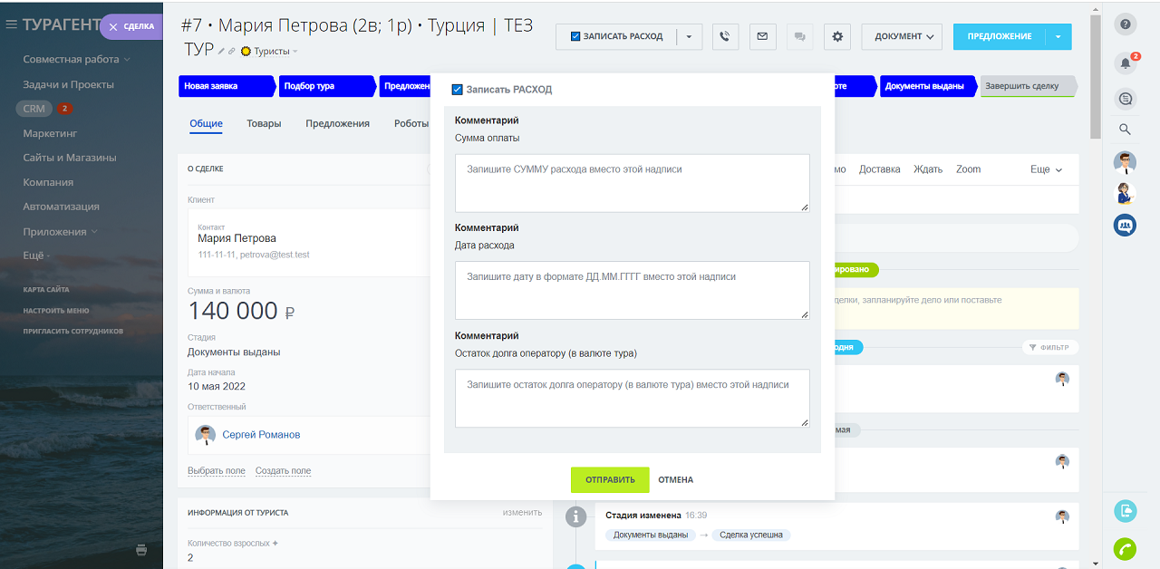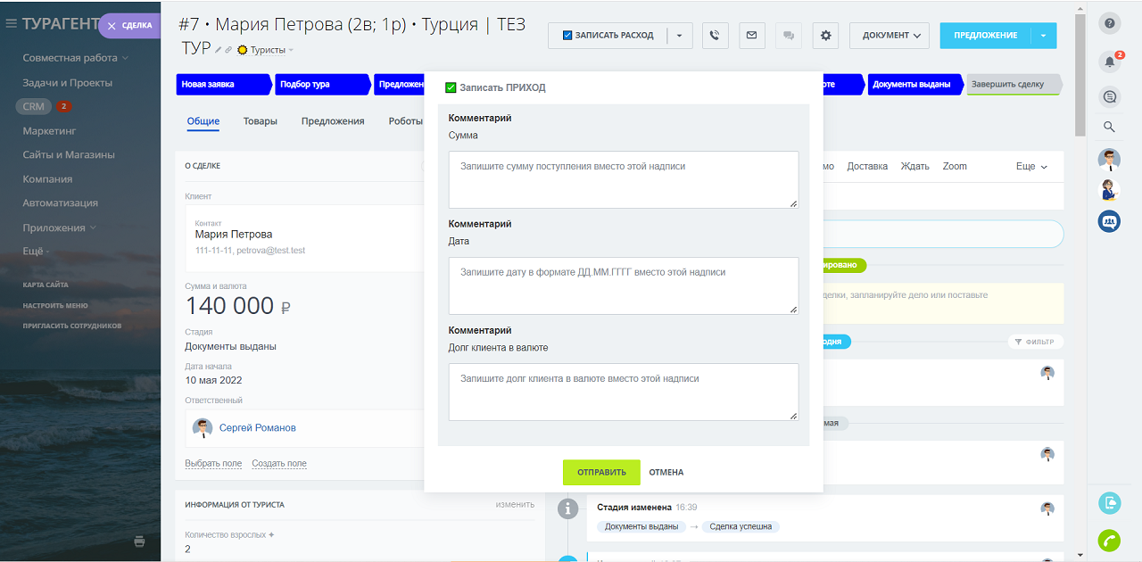 - ✅ Записать ПРИХОД – сценарий записывает поступление денежных средств от Туриста и выполняет расчет остатка задолженности (для сделок в воронке ТУРИСТЫ)