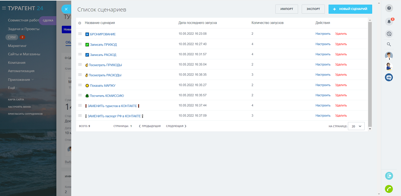 Умные сценарии для отраслевой CRM "Турагент24: CRM для турагентства". Дополнение для автоматизации работы в CRM Турагент24. Работает только в установленной отраслевой CRM.