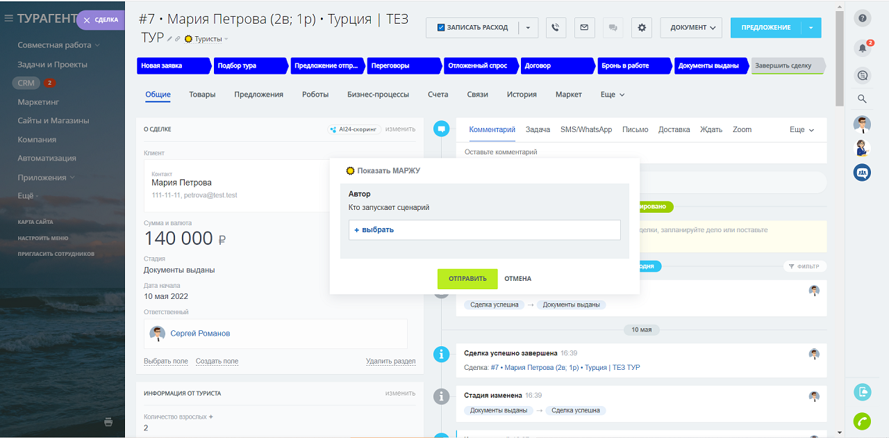 - ☀️ Показать МАРЖУ – сценарий выполняет расчет Маржи по текущей сделке и выводит её в уведомление и комментарий (для сделок в воронке ТУРИСТЫ)