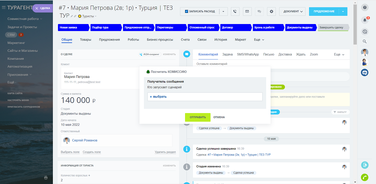 - ♻️ Посчитать КОМИССИЮ - сценарий выполняет расчет комиссии менеджера по текущей сделке и выводит её в уведомление и комментарий (для сделок в воронке ТУРИСТЫ)