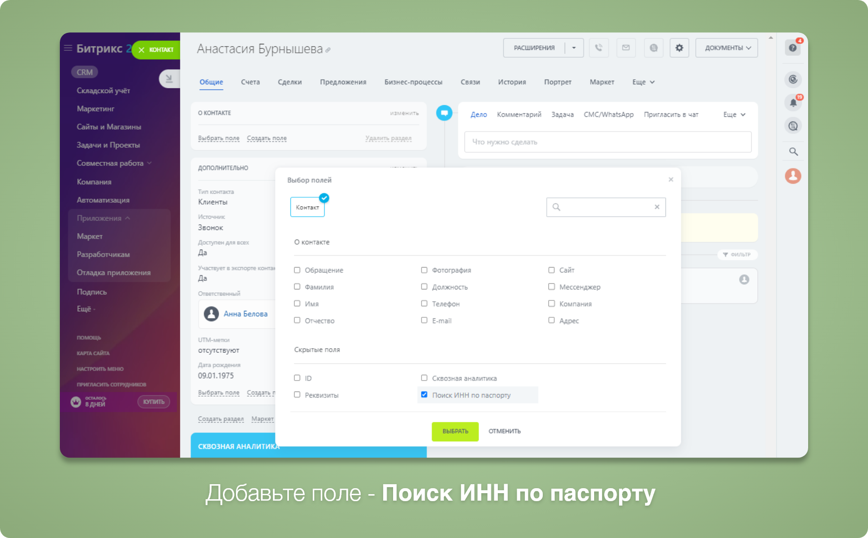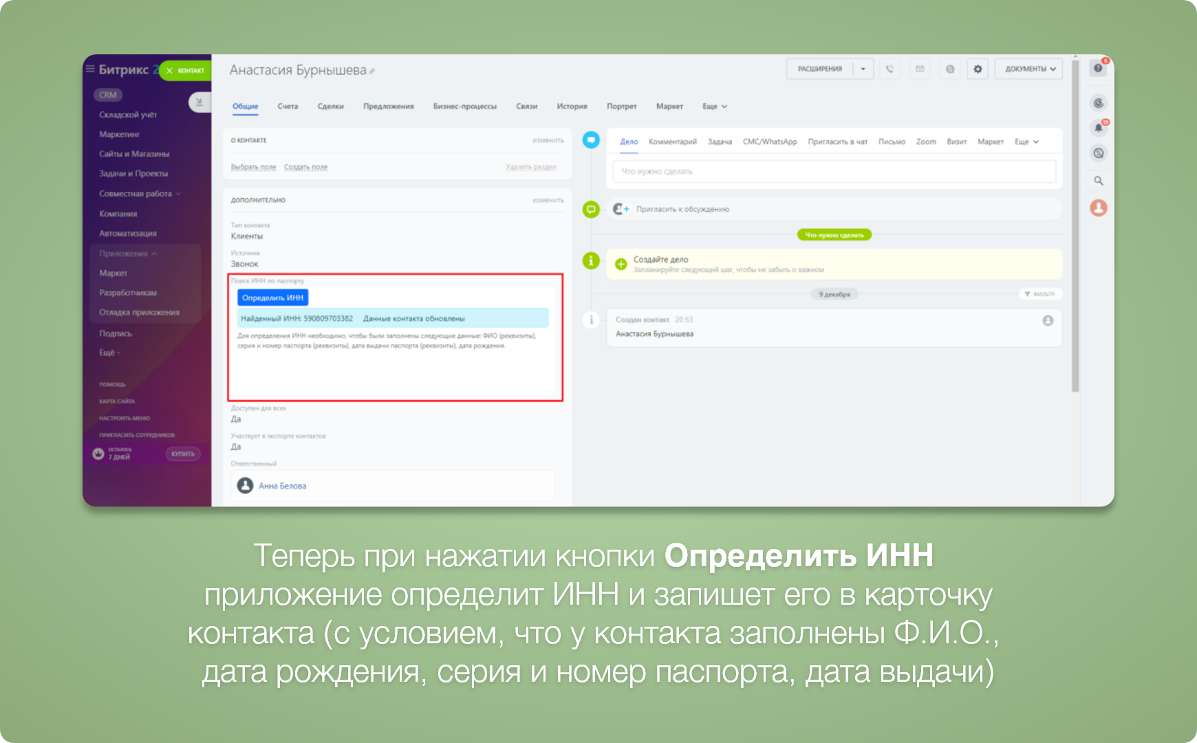 Мы предлагаем удобное интегрированное решение, которое поможет вам быстро и точно определить ИНН вашего контакта. Просто заполните необходимые данные, такие как: