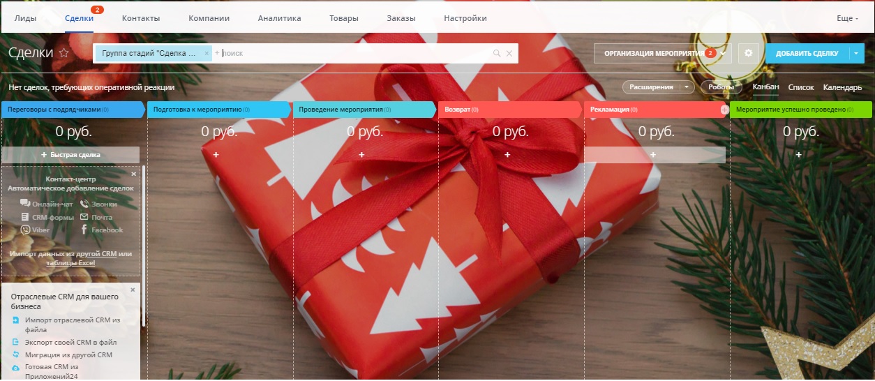 С этим решением EVENT сфера получает готовую и настроенную под себя CRM-систему. Настроены три направления работы в CRM: первое - ведение продаж по новым и существующим клиентам, второе - контроль организации мероприятия, третье - поиск подрядчиков. Реализовано создание группы для ведения проектной работы по мероприятию. По сравнению с бесплатной версией добавлено направление для поиска подрядчиков, форма бронирования площадок, услуг и ответственных сотрудников на мероприятие, а также выставление автоматических задач из CRM.