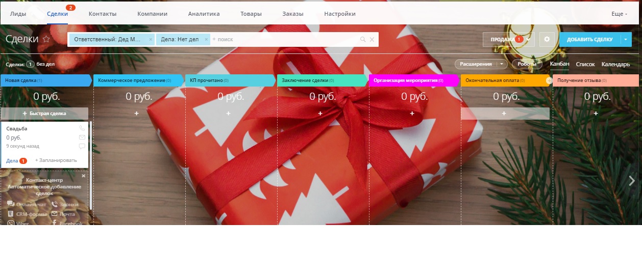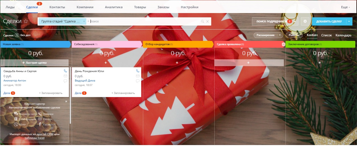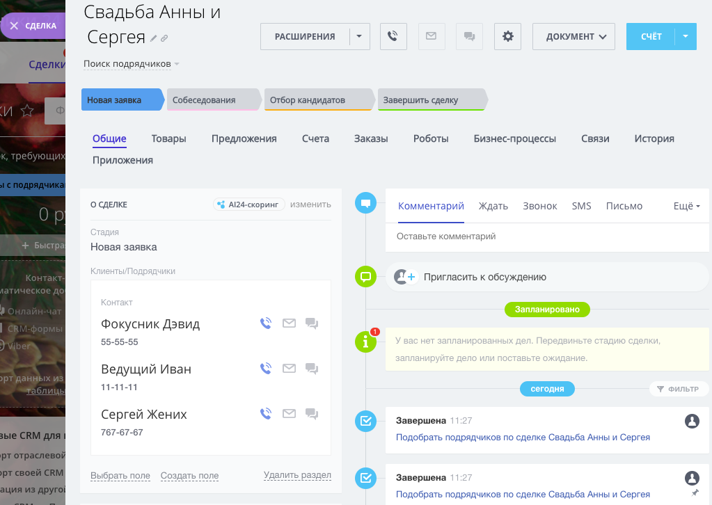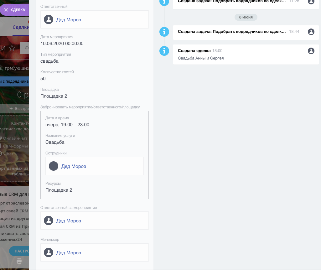 ⁃ новая заявка - поиск подрядчиков по мероприятию, добавление их в сделку (аниматоры, ведущие, артисты, декораторы, фотографы, площадка для проведения и т.д.).