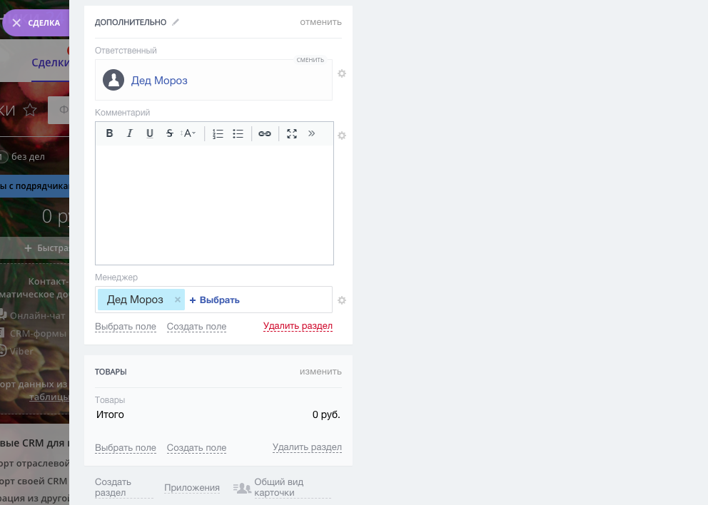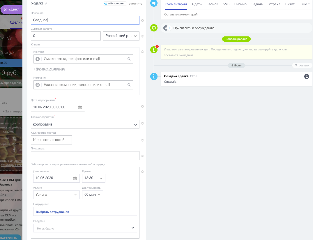 Это полная и подробная информация о заказе: участвующие в сделке контакты и компании (кроме клиента, можно ещё привязать внешних подрядчиков), сумма заказа, товары (если необходимо), дата мероприятия, тип мероприятия (корпоратив, свадьба, детский праздник, День Рождения, другое), площадка, коммерческое предложение (файл), смета (файл) и комментарий к сделке.