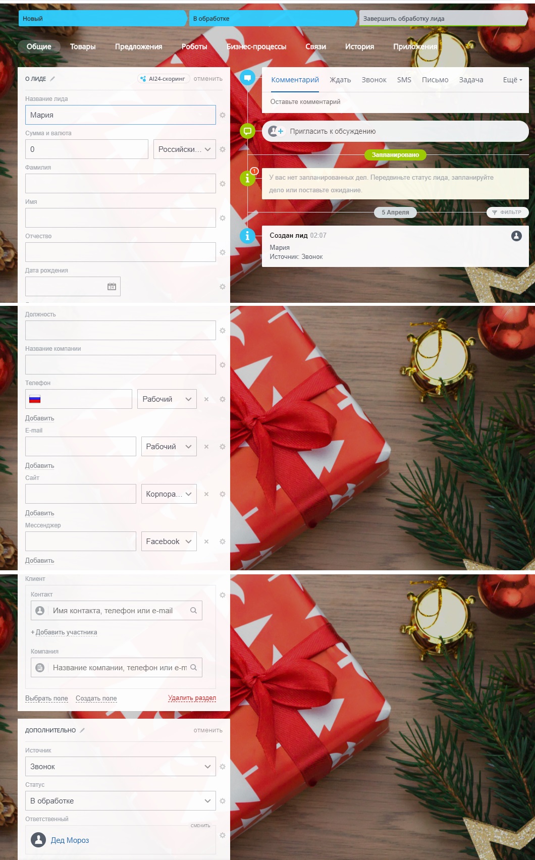 Это начальная информация о клиенте и заказе: ФИО, телефон, почта, другие контактные данные, дата рождения, адрес, название компании, должность (для корпоративных клиентов), возможность привязать существующие в базе контакт и компанию, возможная сумма заказа, источник лида, а также комментарий об этом лиде.