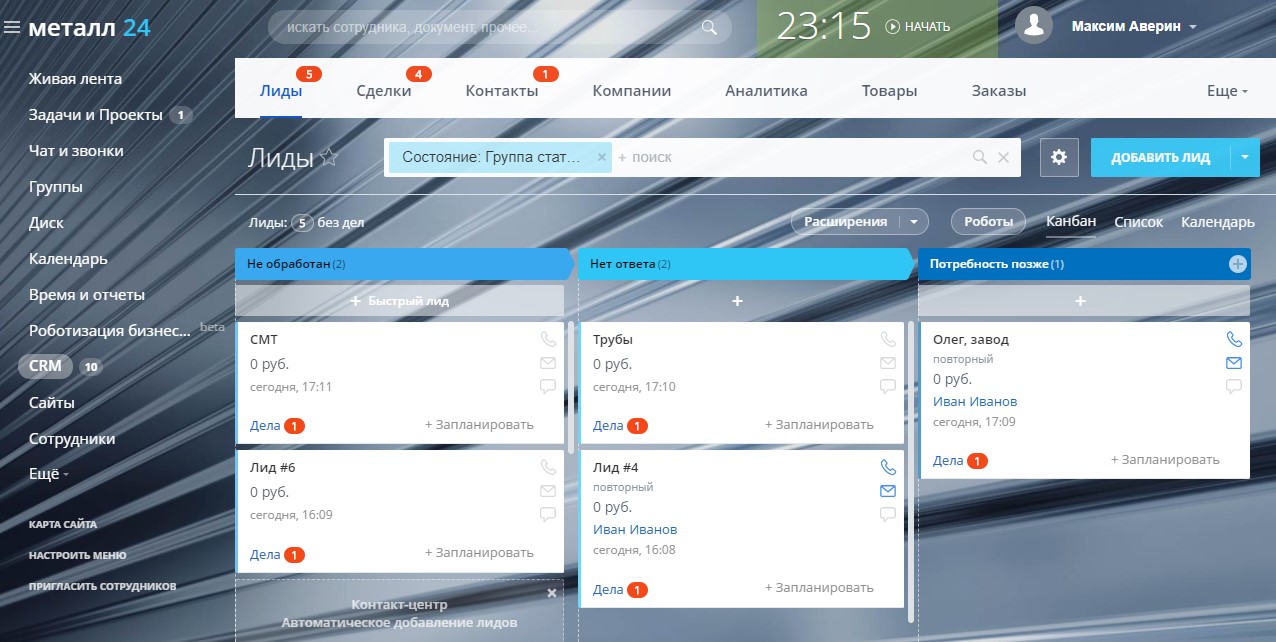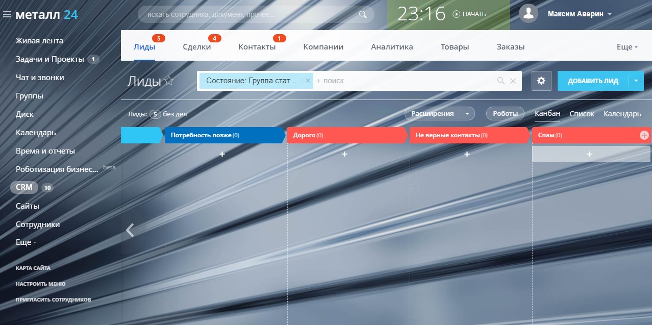 - настроена воронка продаж для Лидов,
