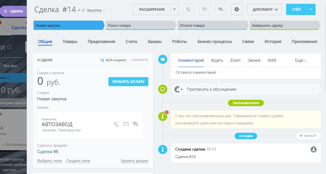 Для Сделок в направлении закупка созданы пользовательские поля в карточке и настроены максимально подходящие стадии ведения клиента: