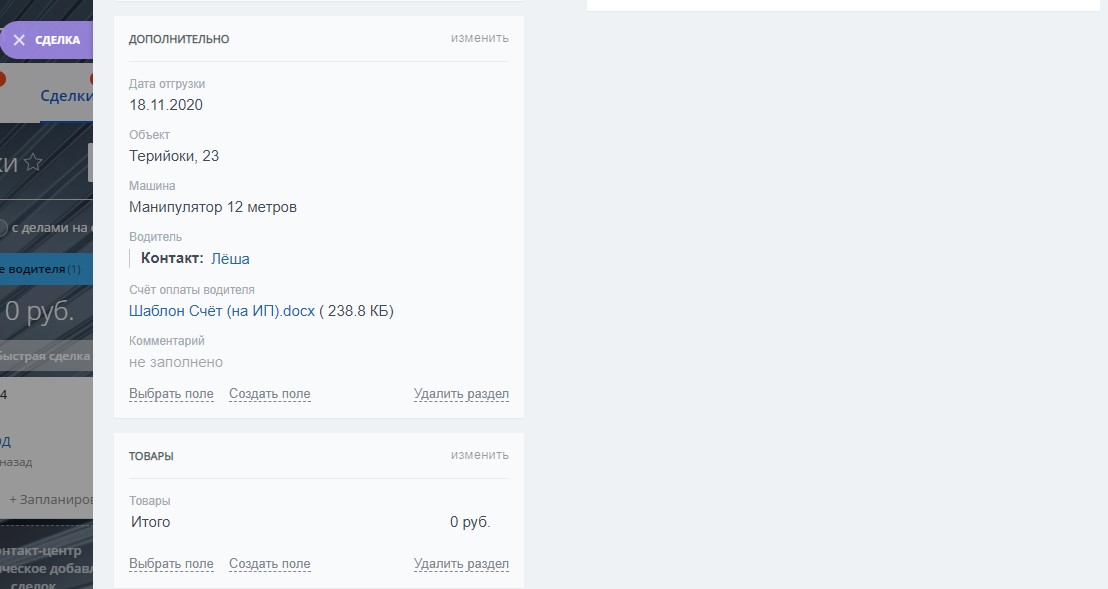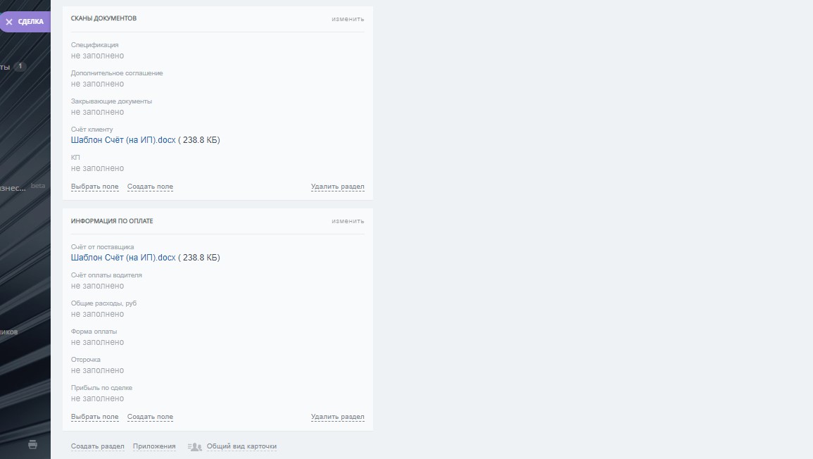 В карточке сделки по направлению "ЛОГИСТИКА" добавлены пользовательские поля: