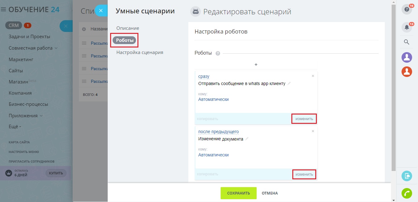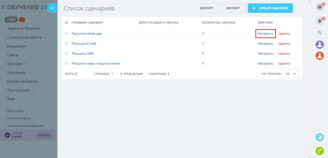 - Перед работой с каждым сценарием можно настроить поля для результата рассылки