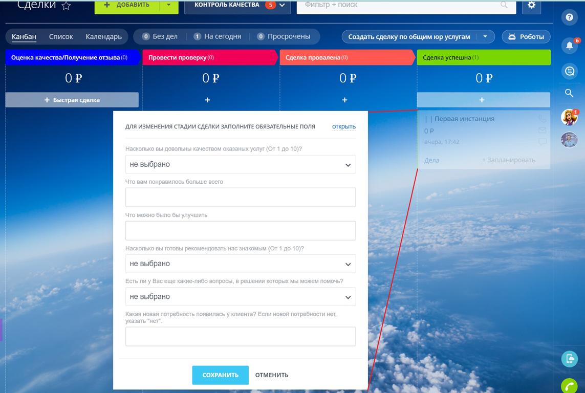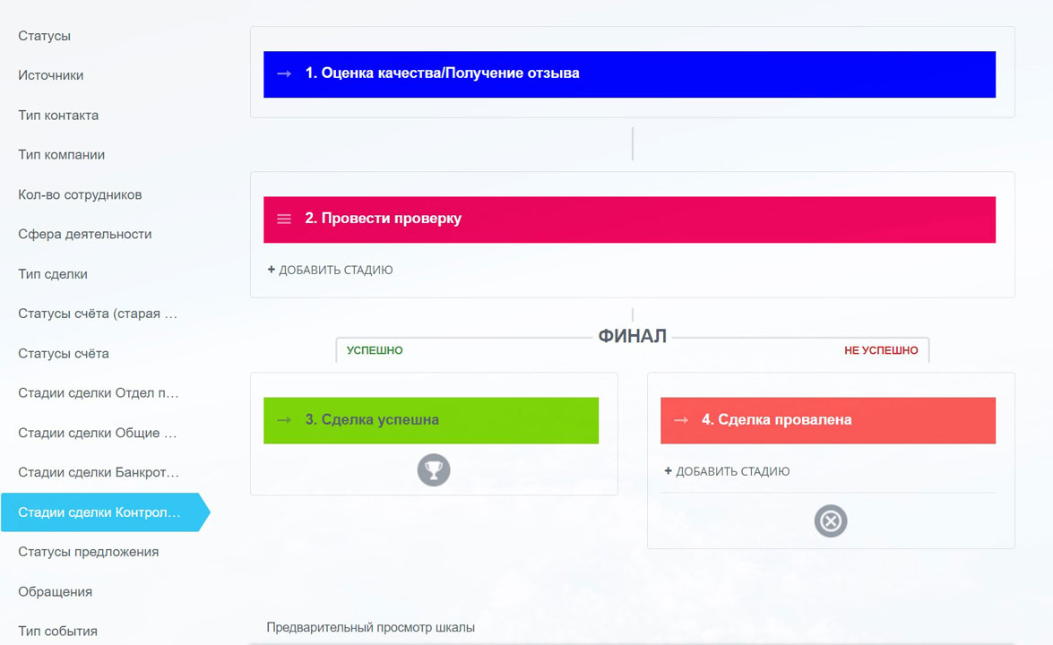 Воронка "Контроль качества": Оценка качества/получение отзыва, Провести проверку, Сделка провалена, Сделка успешна