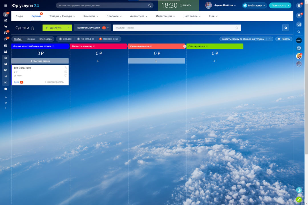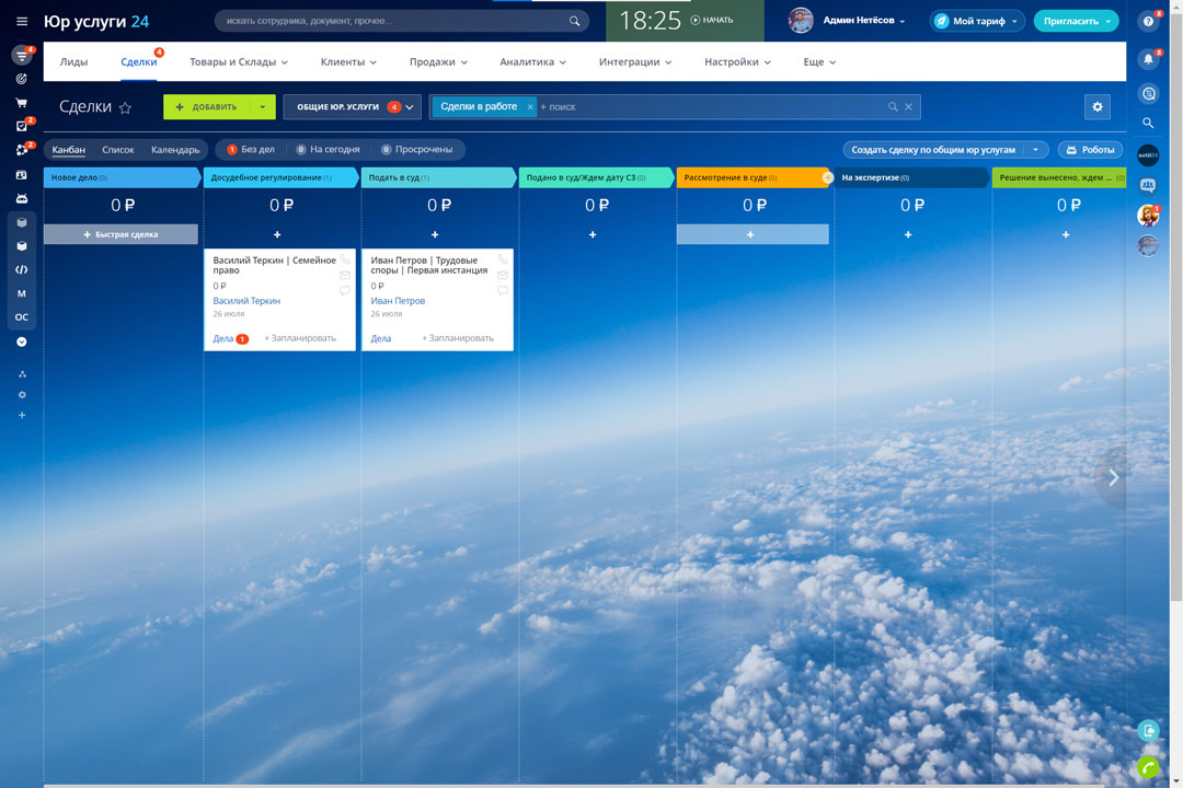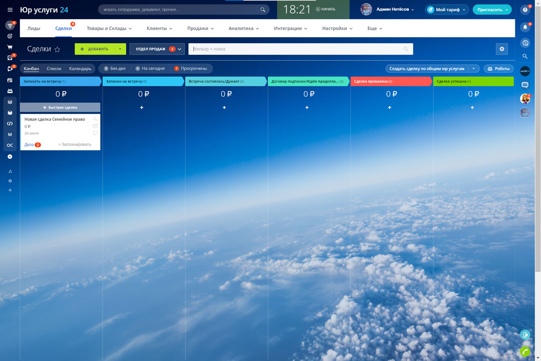2. Базовый - доступны воронки в сделках: Отдел продаж, Общие юр. услуги, Банкротство физических лиц, Контроль качества. В сделках доступна автоматическая постановка задач, отправка уведомлений сотрудникам и клиентам, контроль сроков нахождения сделок на стадиях, туннели продаж