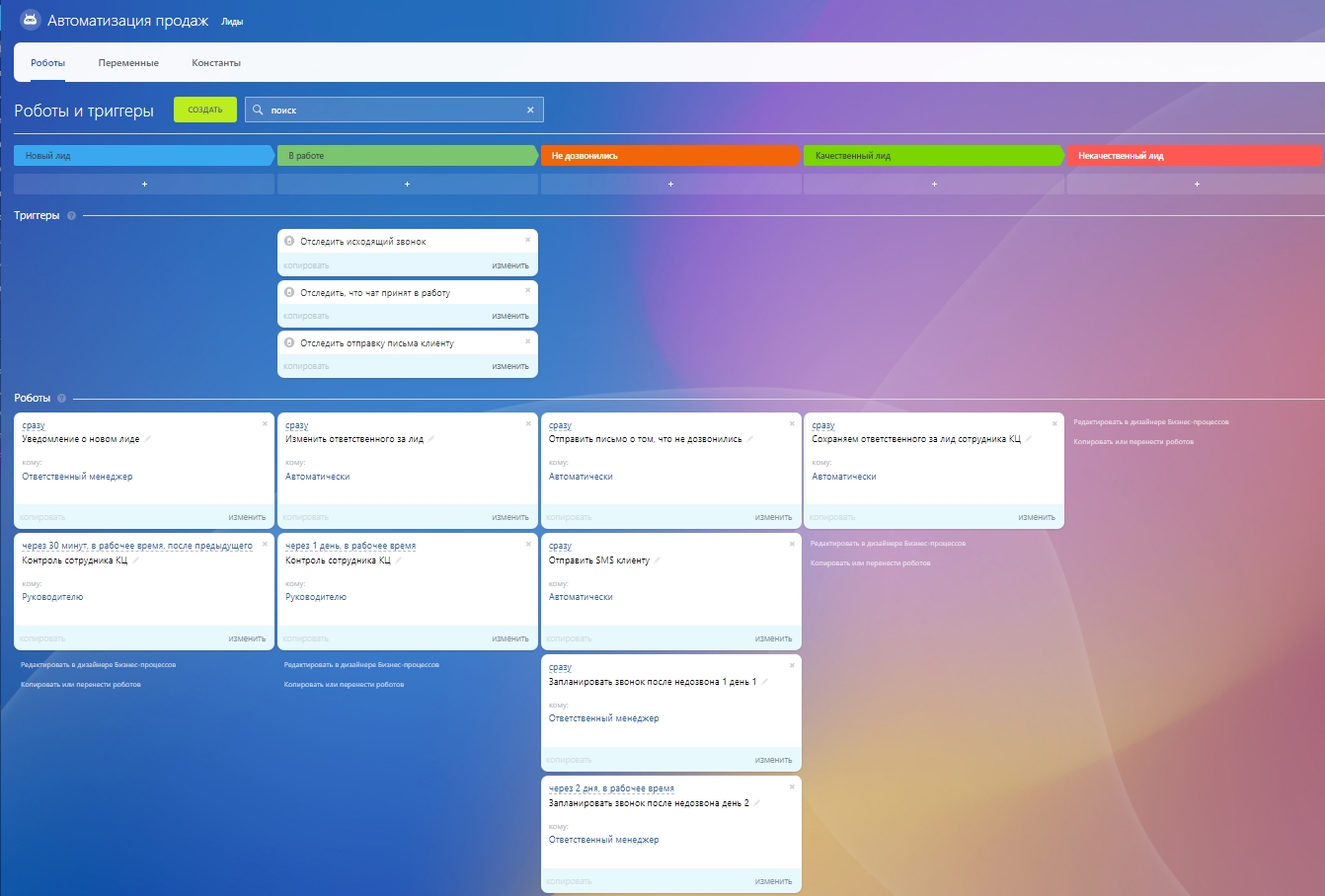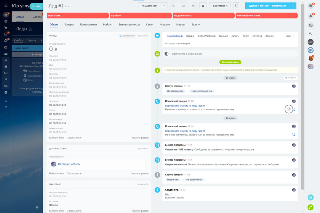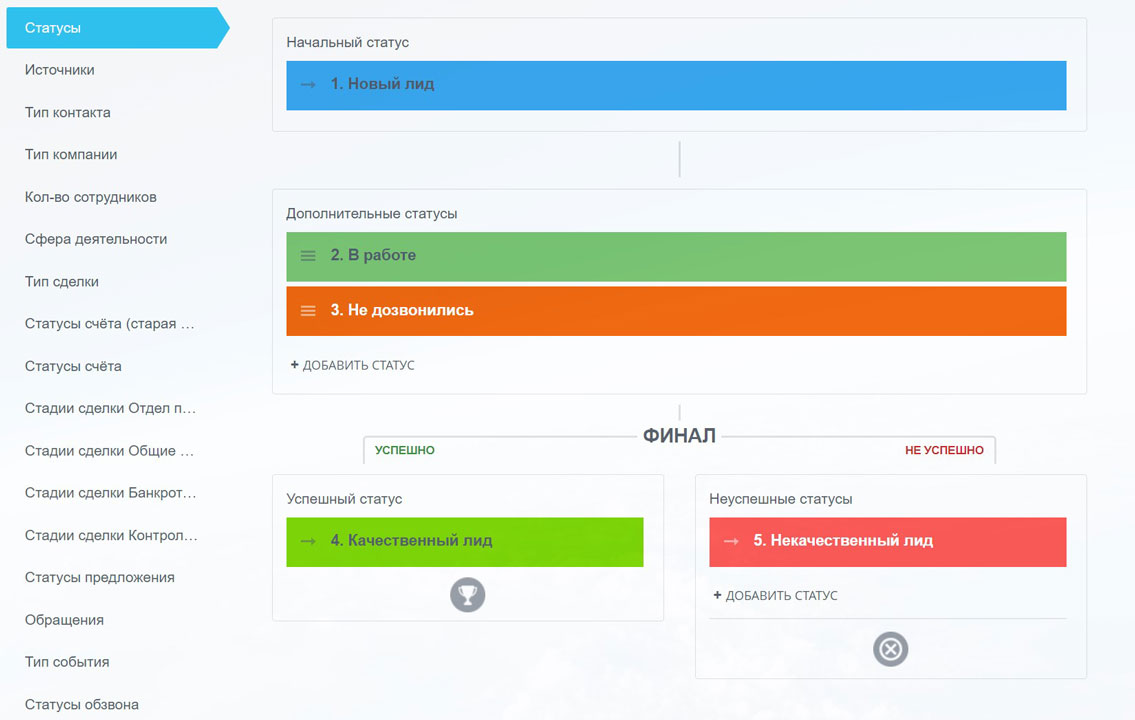 Новый лид, В работе, Не дозвонились, Некачественный лид, Качественный лид