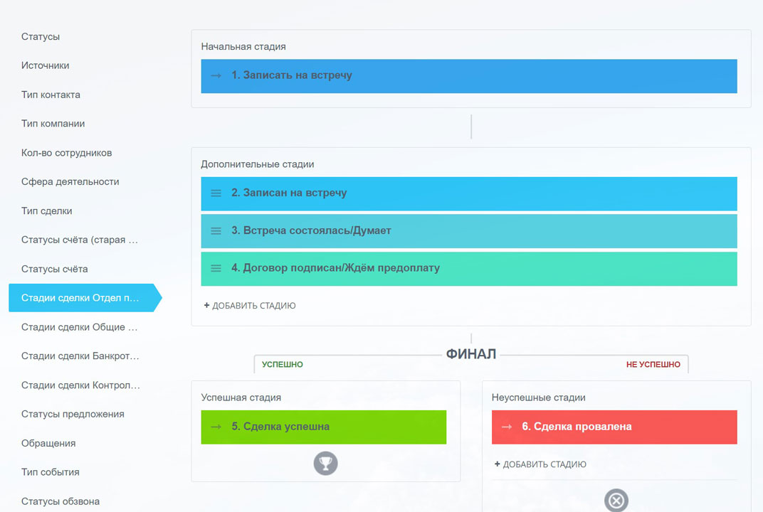 Воронка "Отдел продаж": Записать на встречу, Записан на встречу, Встреча состоялась/думает, Договор подписан/ждем предоплату, Сделка провалена, Сделка успешна