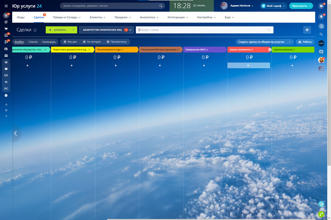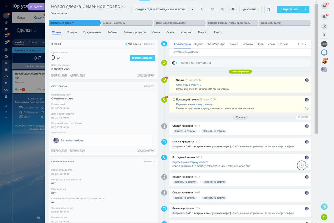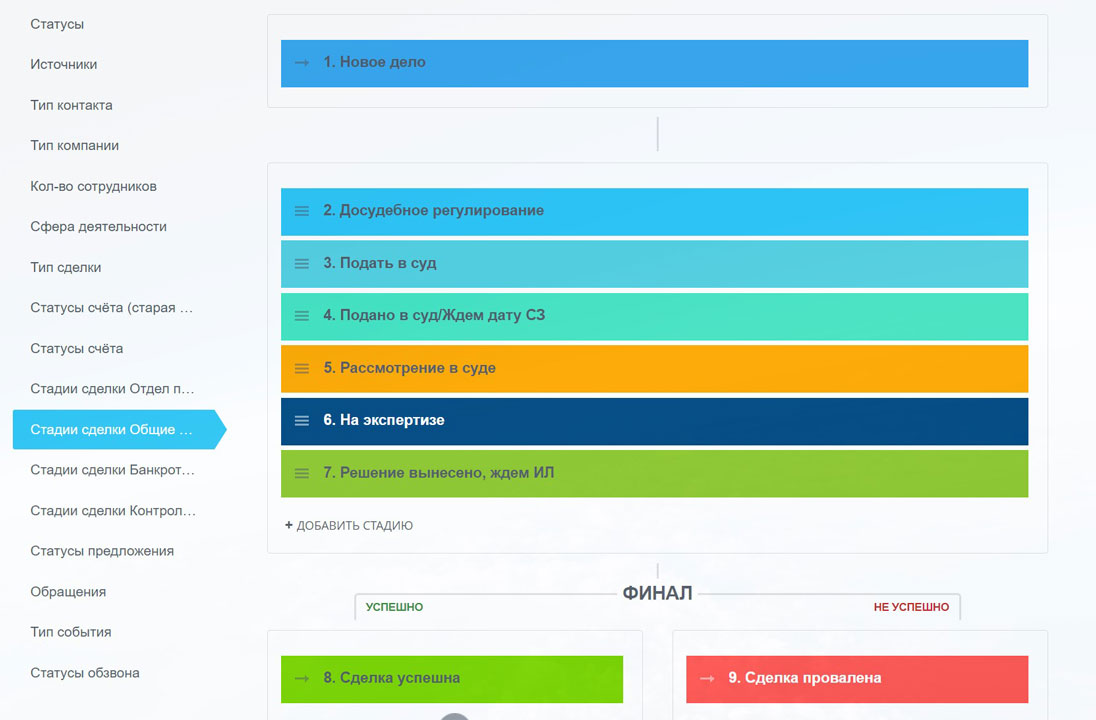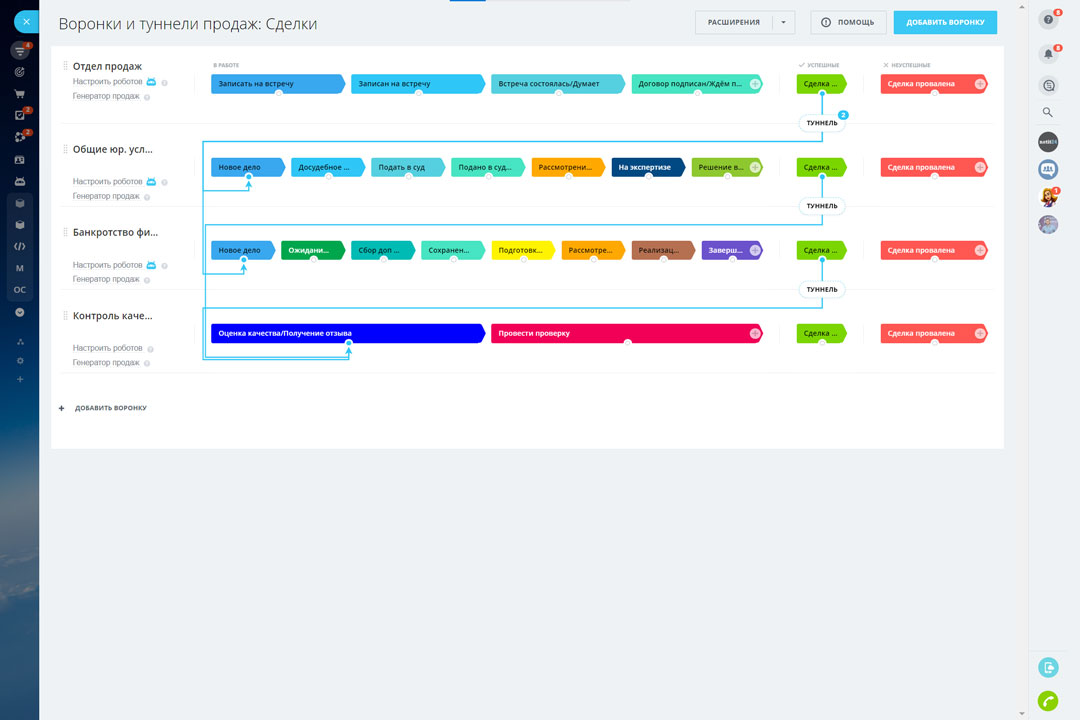 4. Повышается эффективность юридического отдела с помощью специальных воронок для юристов ("Банкротство физических лиц", "Общие юр. услуги" )