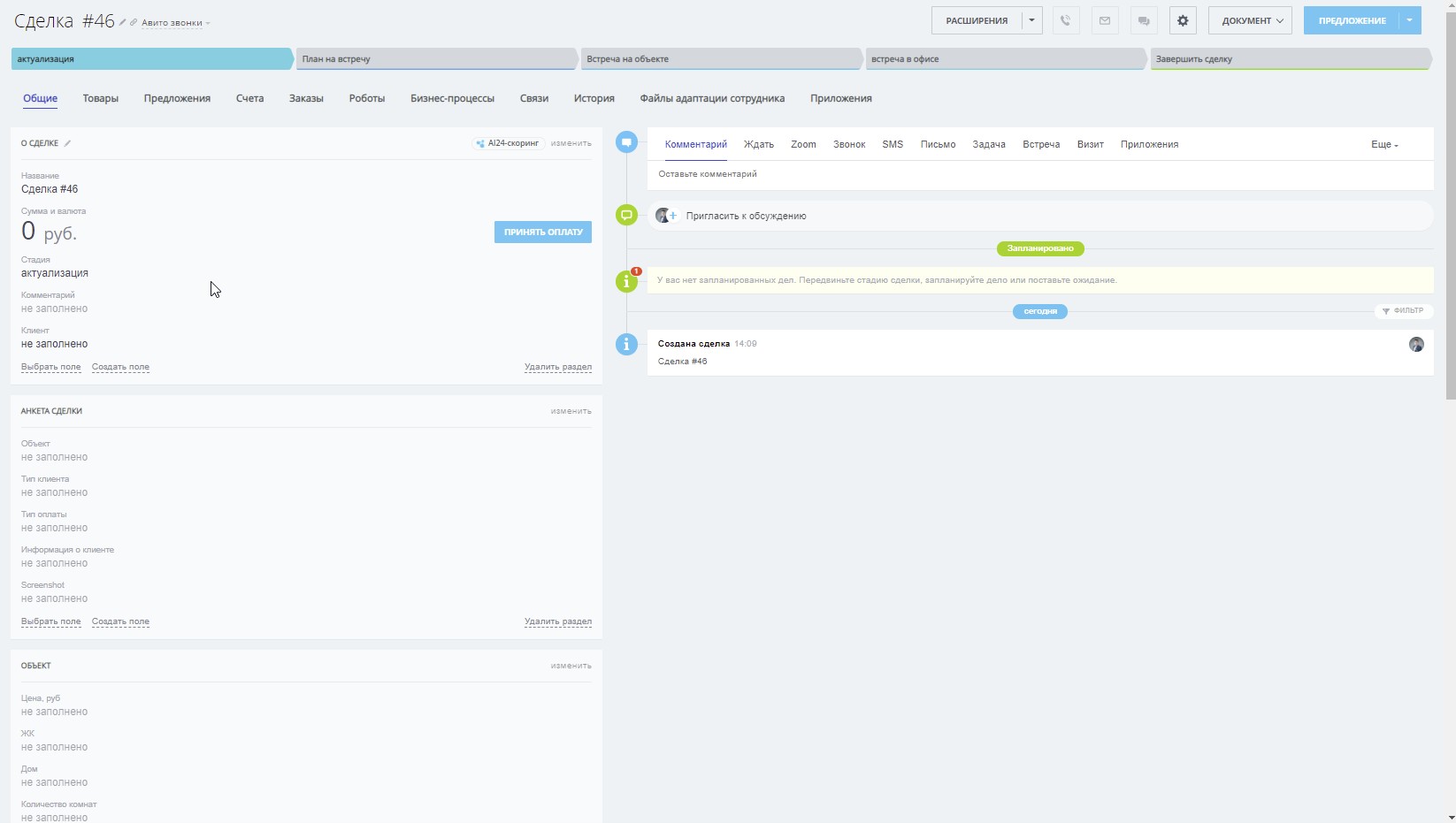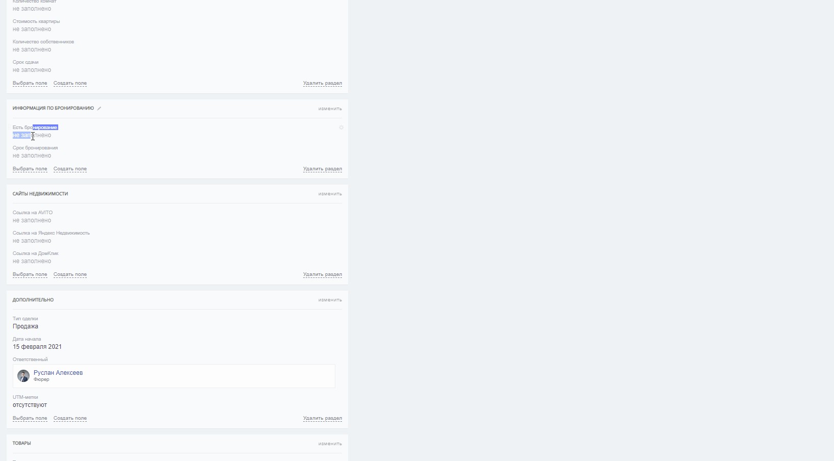 Готовое отраслевое решение для агентств недвижимости, риэлторов. Затрагивает основные сферы этой деятельности. Решение призвано упростить, ускорить и оптимизировать Вашу работу с клиентами. Для этого создано 5 основных направлений с дополнительными полями и роботами автоматизации. Эти основные направления помогут Вам "разложить по полочкам" всех своих клиентов и не путаться в последующей работе. Дополнительные поля обрисуют потребности и желания Вашего клиента, а работы автоматизации не дадут ничего пропустить и напомнят о важных делах. В карточке CRM создано и добавлено множество полей, распределенных по разделам. Поля: Информация о клиенте, Тип клиента, Объект, Кол-во комнат, Стоимость квартиры, Срок сдачи, Сроки бронирования, Есть бронирование, Тип оплаты, Кол-во собственников, Кол-во комнат, ЖК, Дом, Адрес, Ссылка на Домклик, Ссылка на Яндекс недвижимость, Ссылка на AVITO, Анализ причины провала. CRM решение включает в себя: