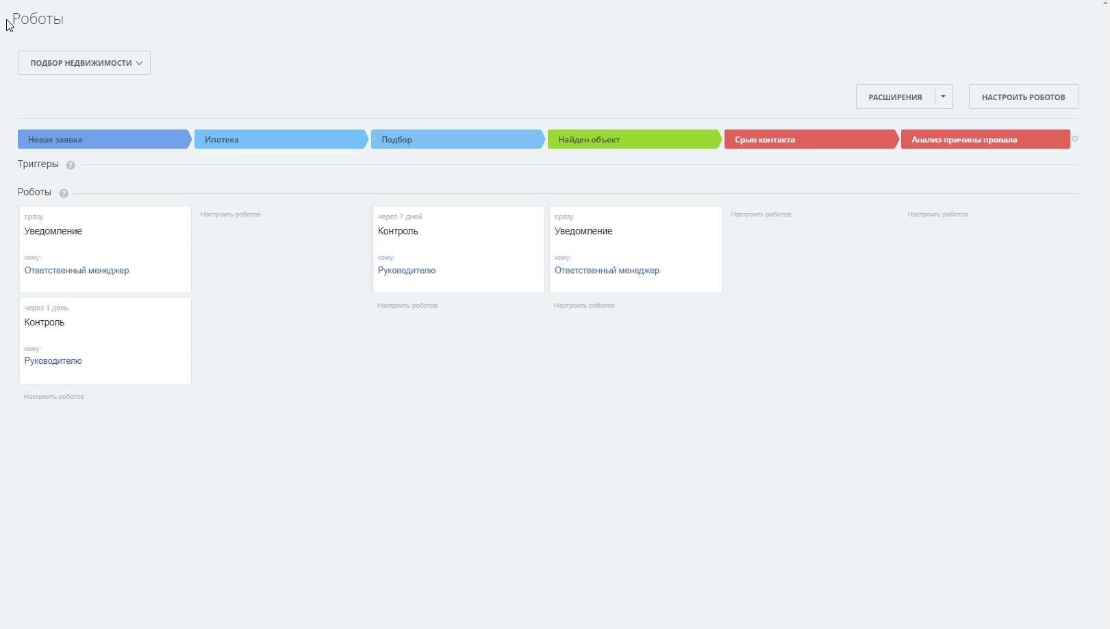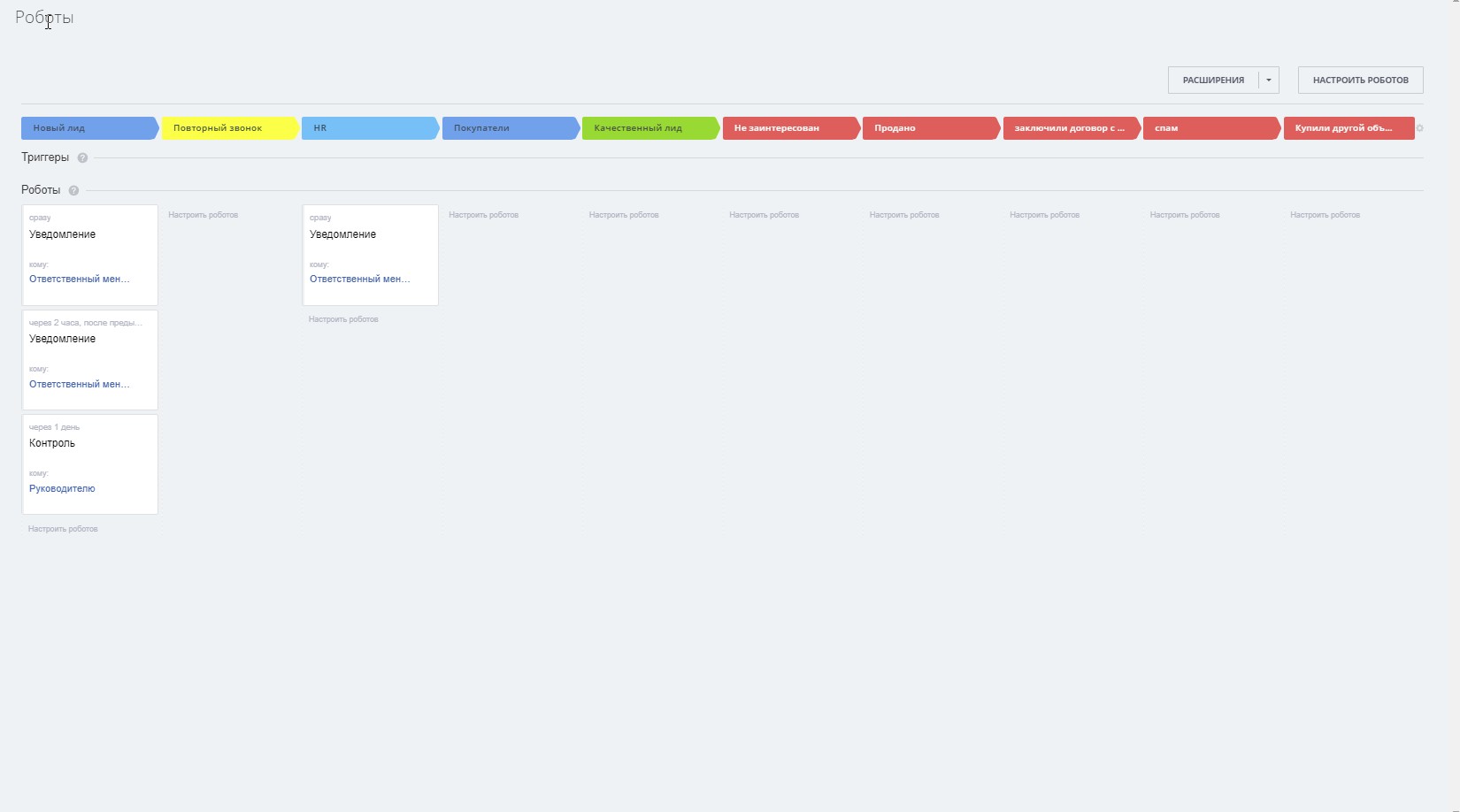 1) Стадия Новая (2 робота уведомления и 1 робот контроля);