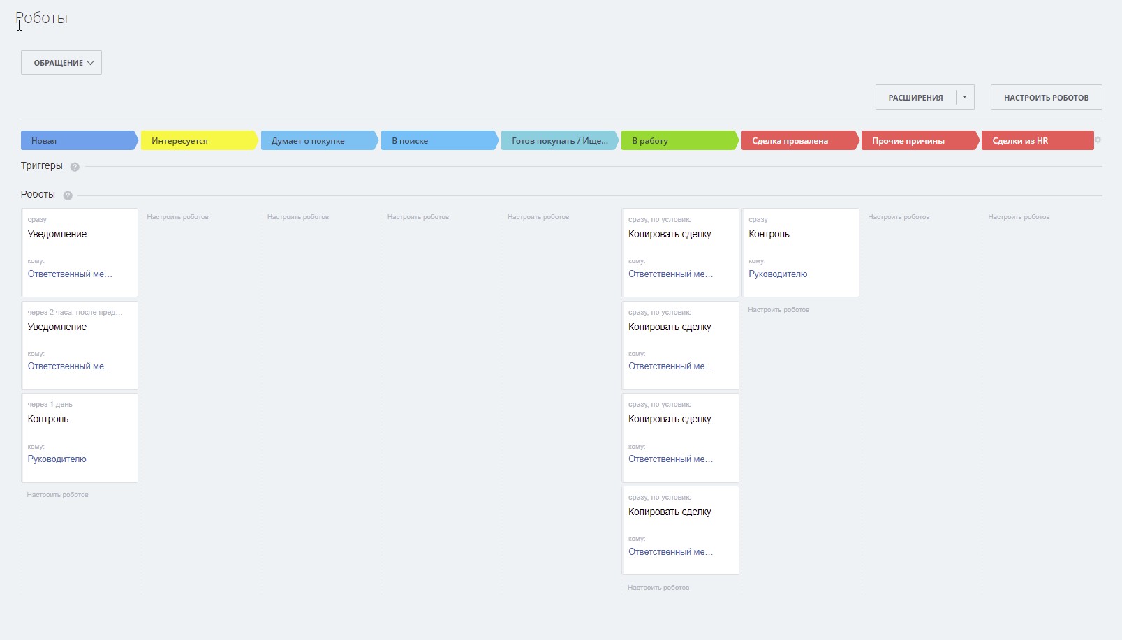 Направление ОБРАЩЕНИЕ (направление для определения и выявления потребностей клиента, автоматизирован процесс уведомлений о новом обращении, а также автоматическое копирование сделки в нужное направление на стадии В работу):