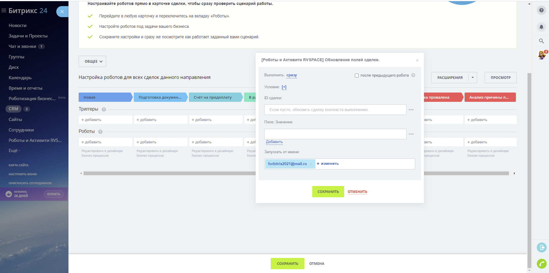 3) Обновление полей сделки (Создан, как и одноименный робот, для массового обновления полей сделок).